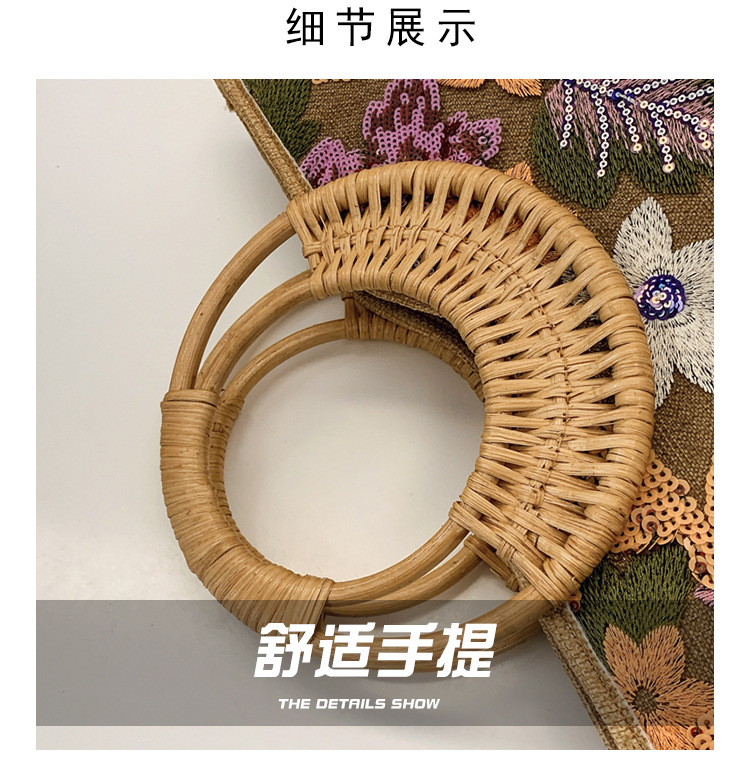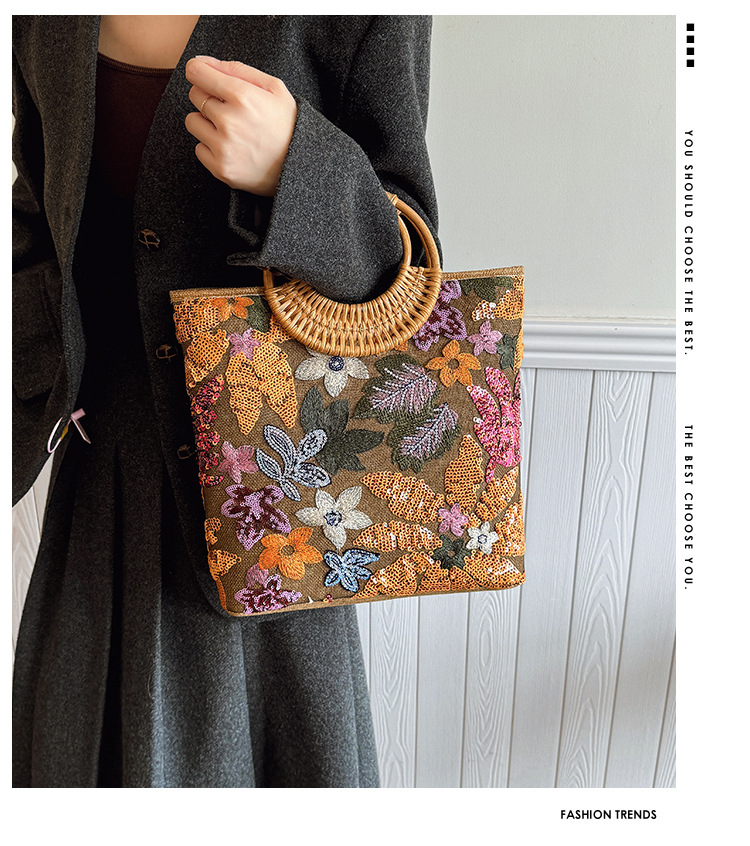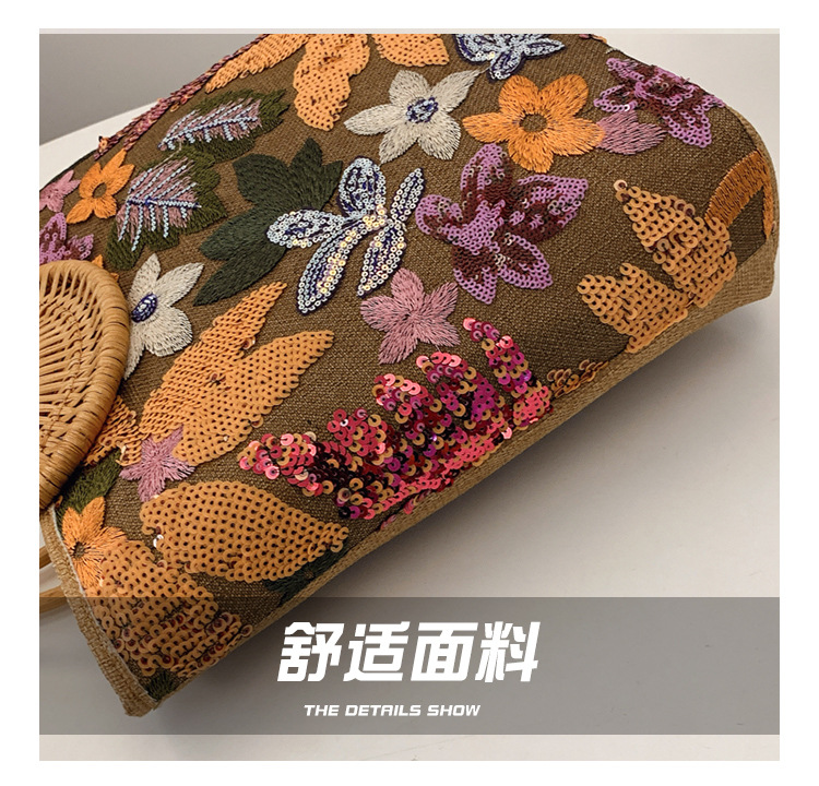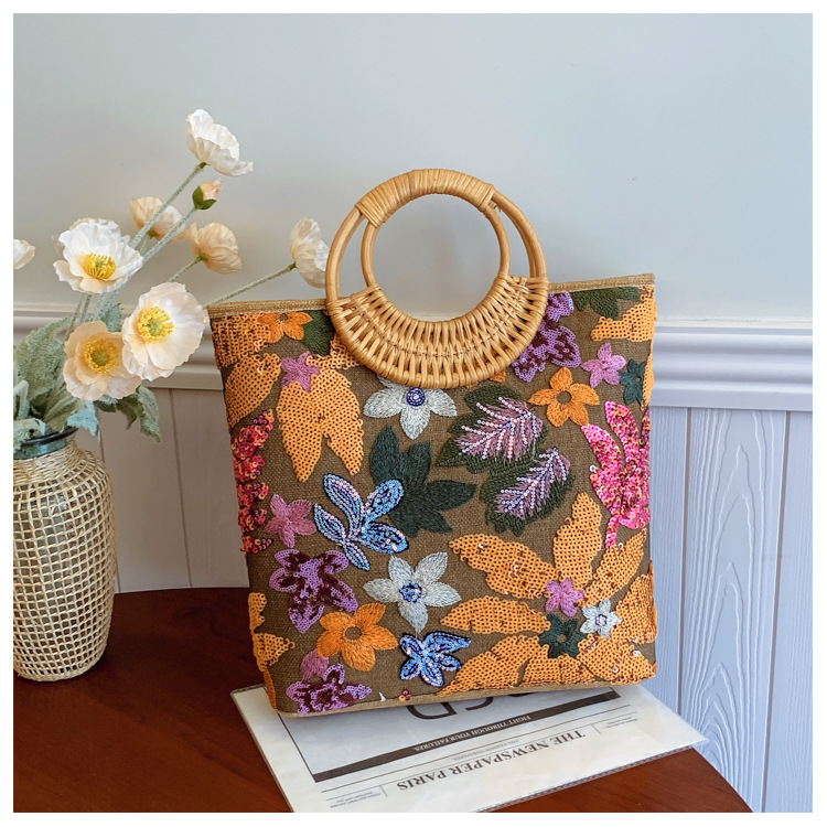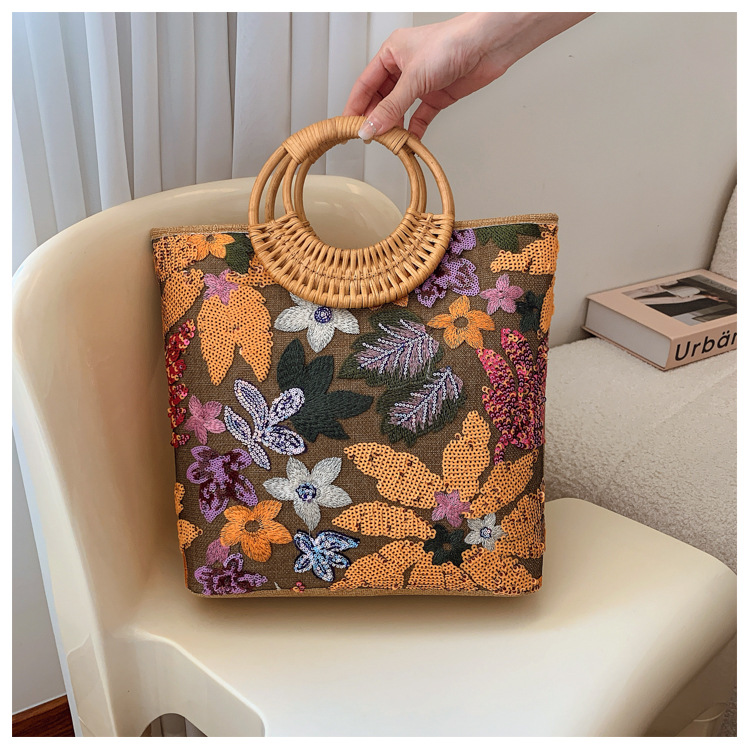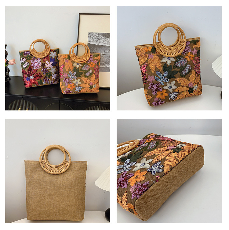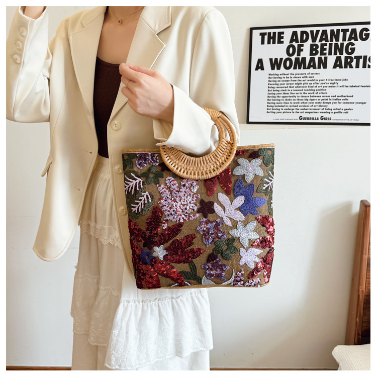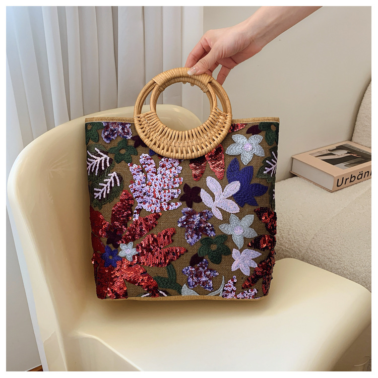 クロスボーダースパンコールストローバッグ、ハイエンドニッチ刺繍バッグ、気質レディーステクスチャードリネン竹ハンドバッグ