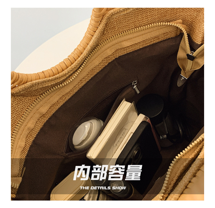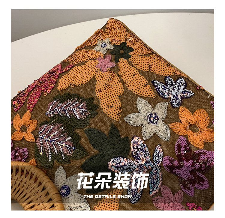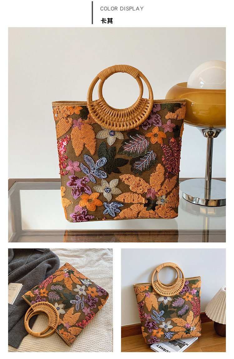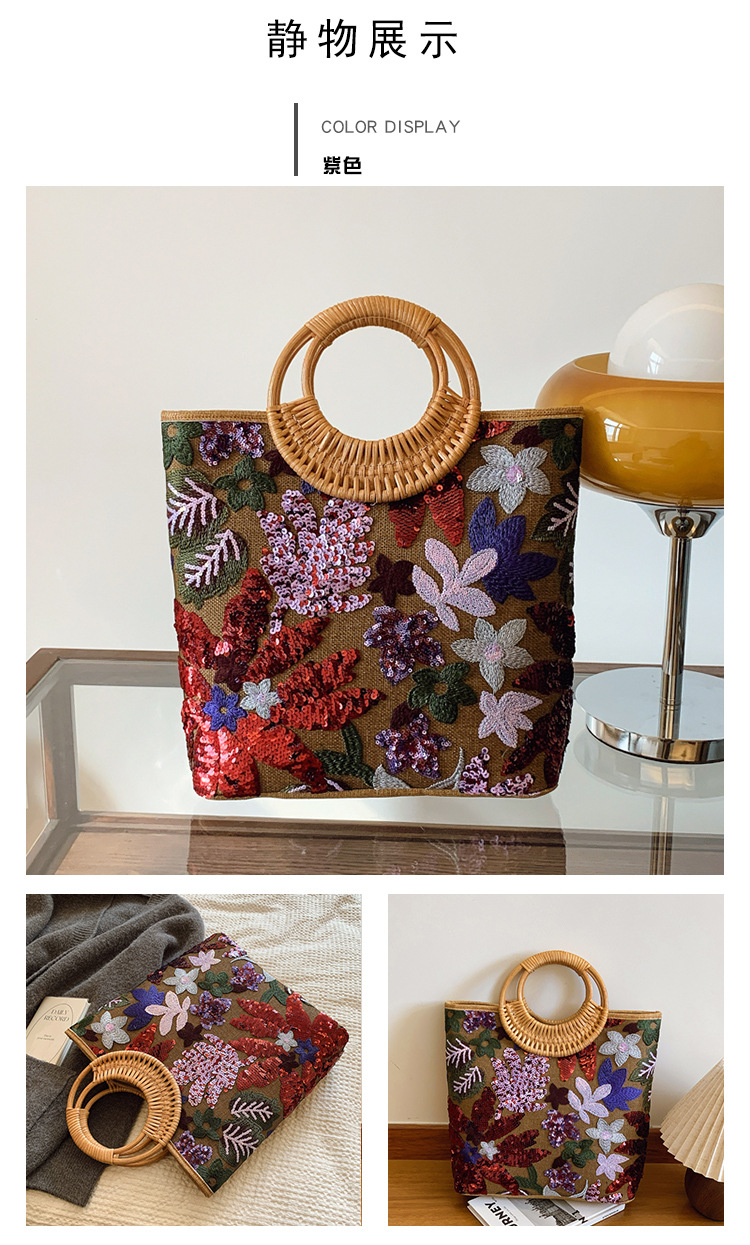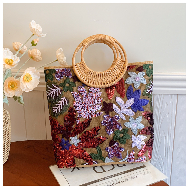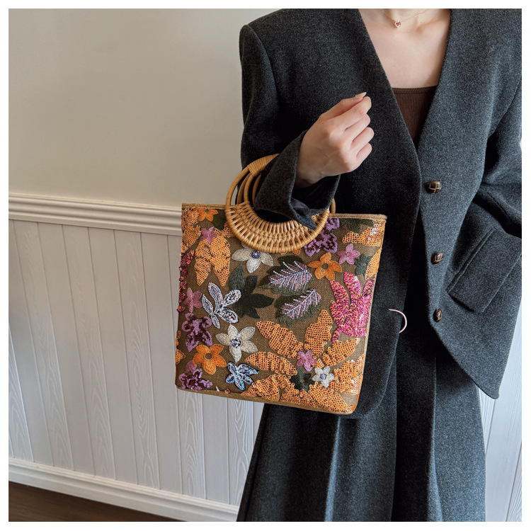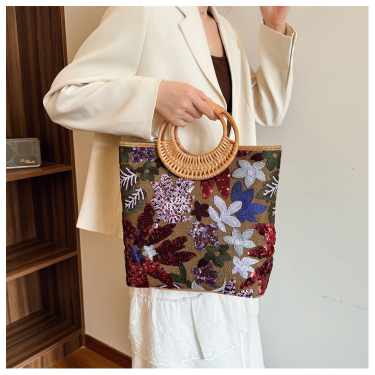 クロスボーダースパンコールストローバッグ、ハイエンドニッチ刺繍バッグ、気質レディーステクスチャードリネン竹ハンドバッグ