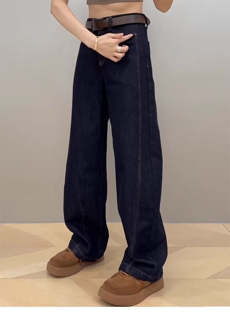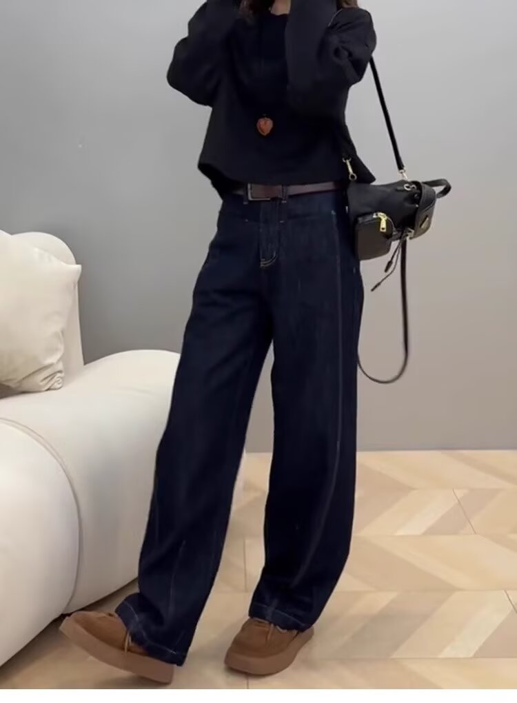 大きいサイズの弾力の小さいラッパのジーパンの女性の2024秋冬の太っているmmのゆったりしている腰はやせているまっすぐな筒の広い足の長いズボンを現します。
