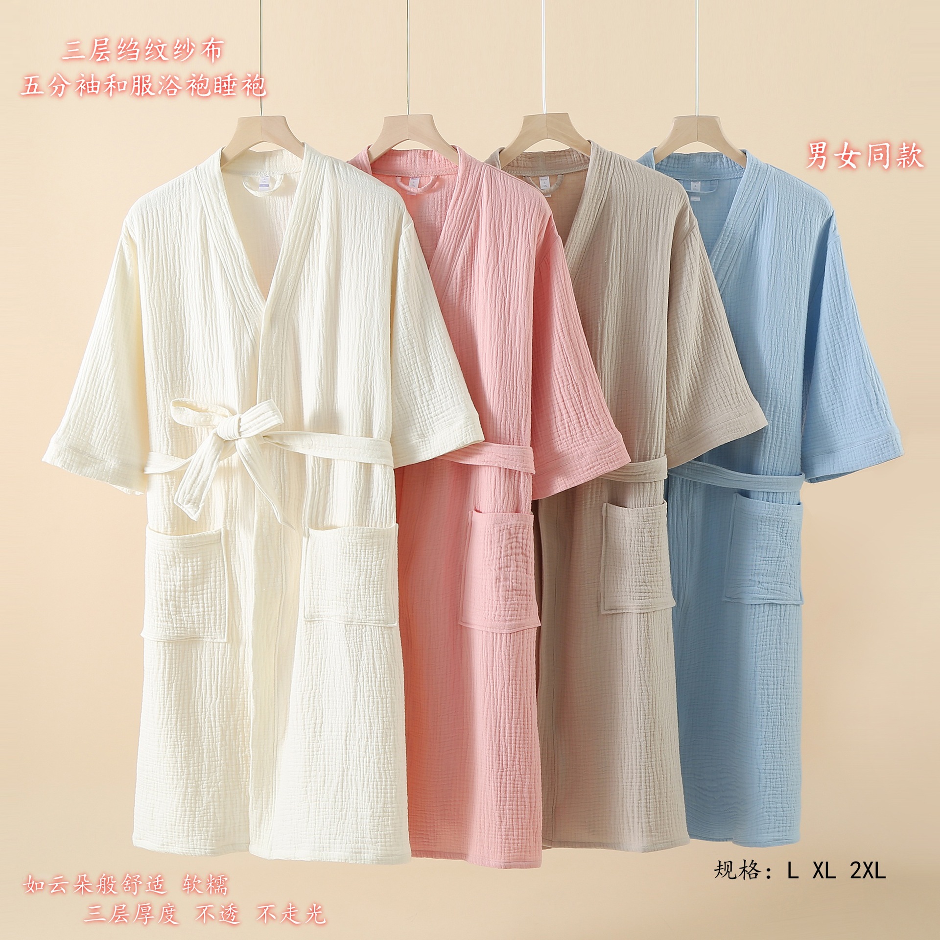 柔软透气的纱布袍,厚薄适合春秋和冬季暖气房内。
