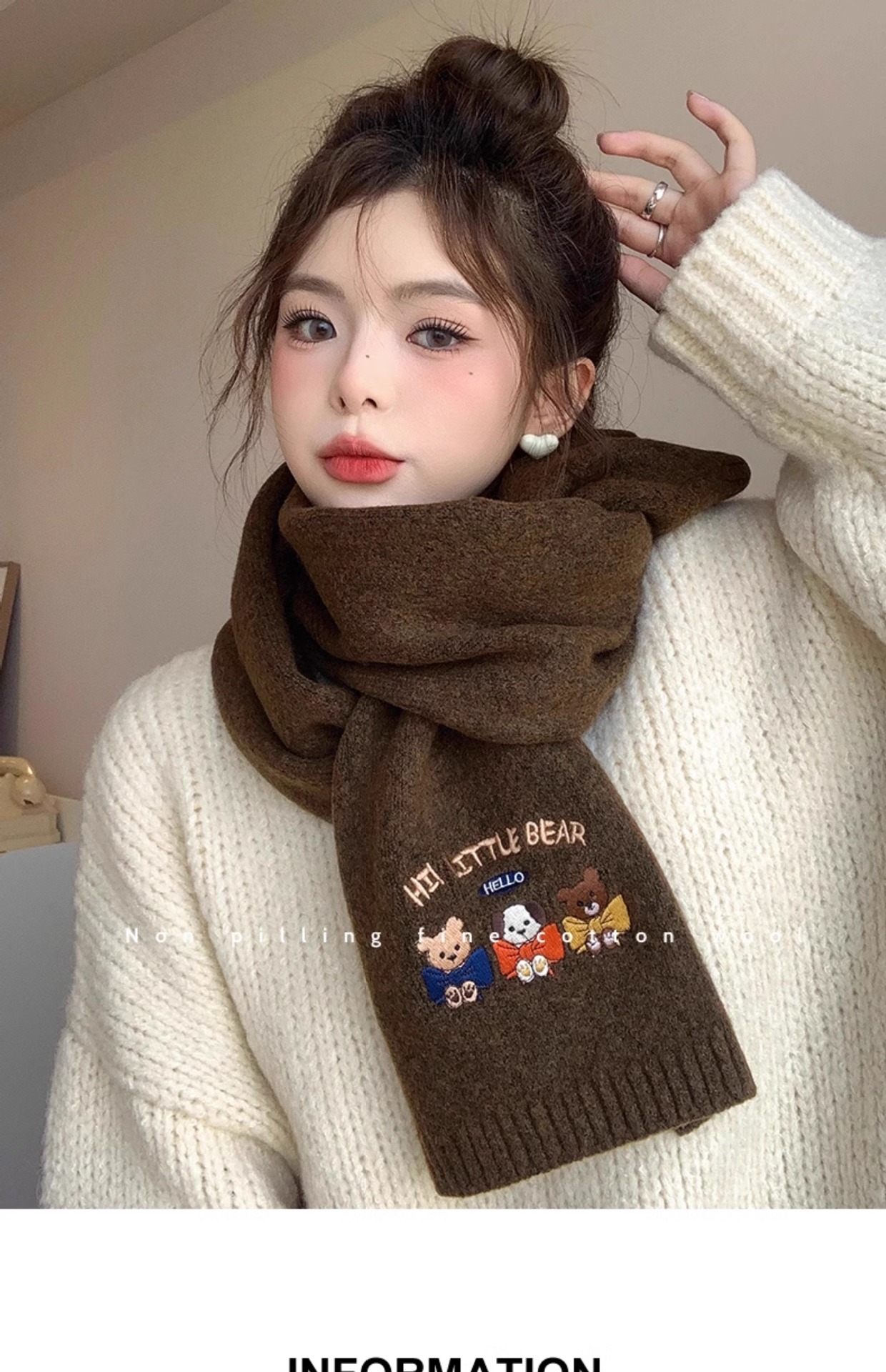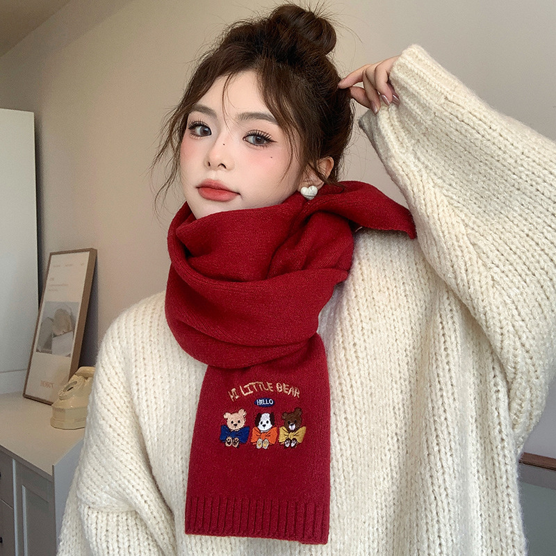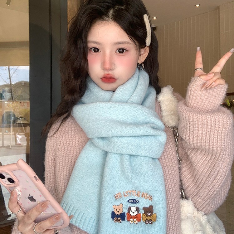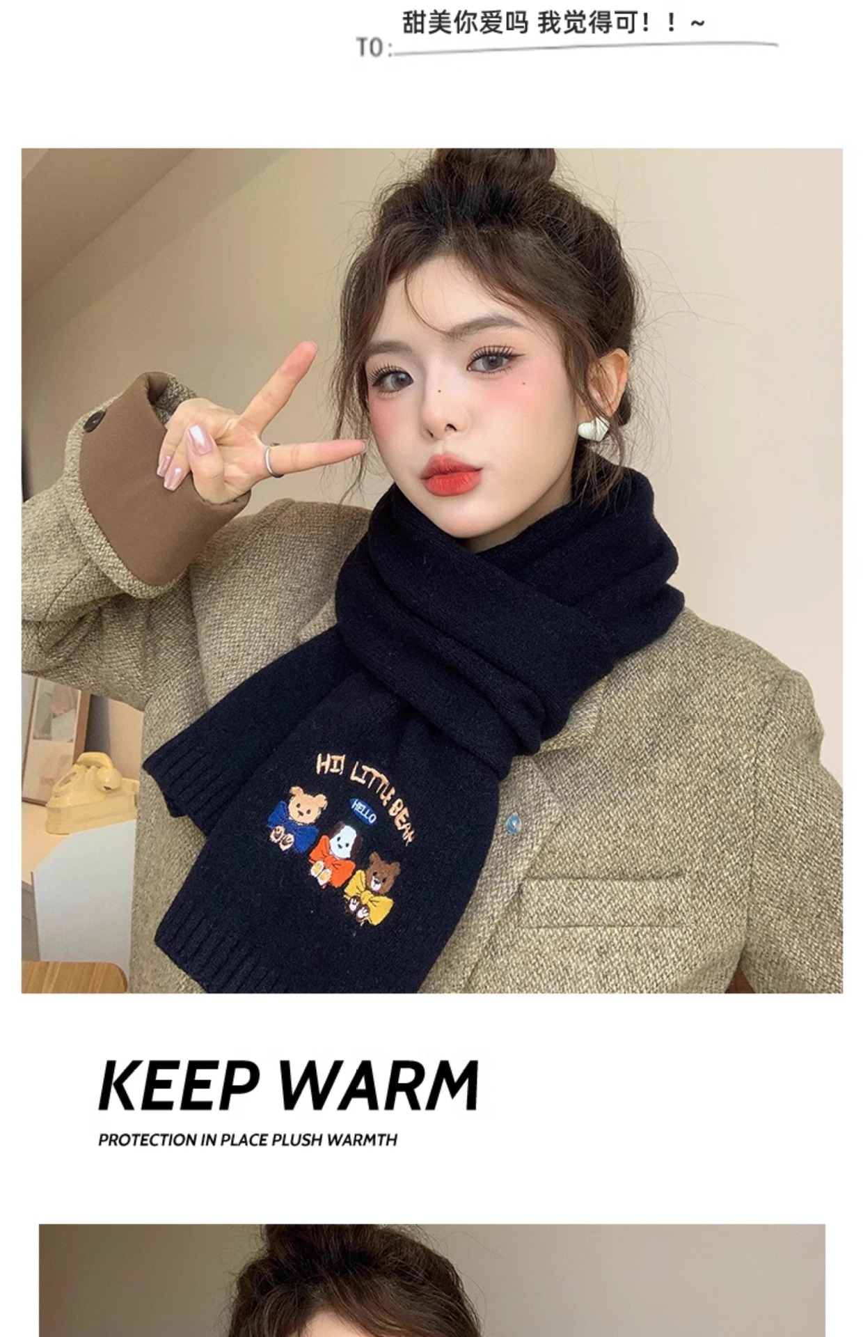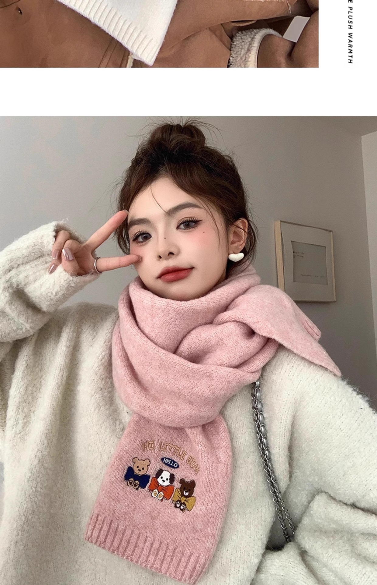 ドーパミンかわいい熊刺繍ニットマフラー女性冬高級感保温防寒百合学生毛糸マフラー