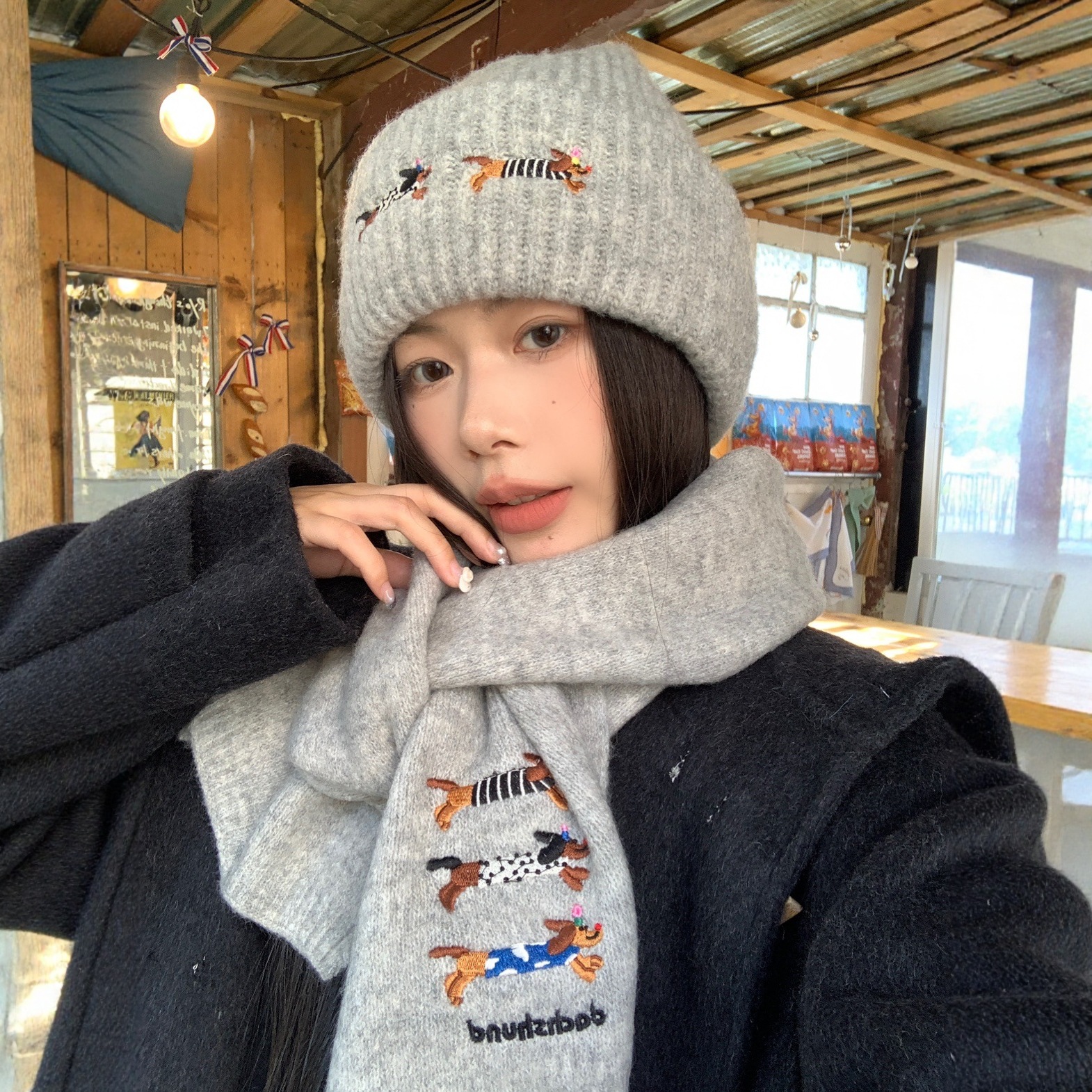 冬季新款帽子围巾套装女可爱腊肠狗毛线帽百搭保暖针织帽时尚围巾
