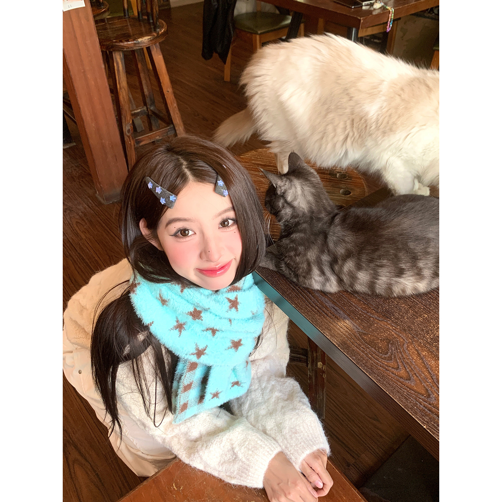 新款加厚防冻保暖围脖高级感复古休闲百搭格纹星星毛绒围巾女冬季