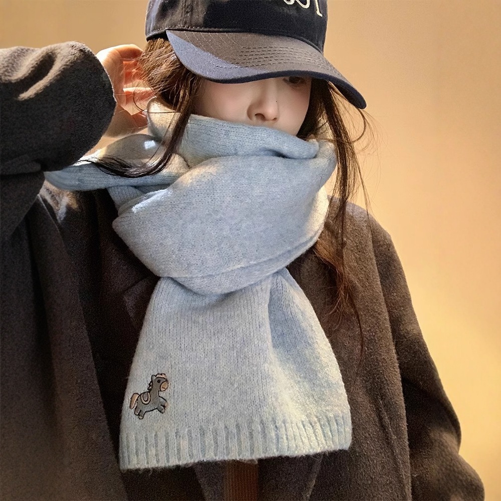 青いニットのマフラーの女性の冬の馬の刺繍の韓国系の雰囲気感の小さい百合の保温の首の小さいマフラーの男