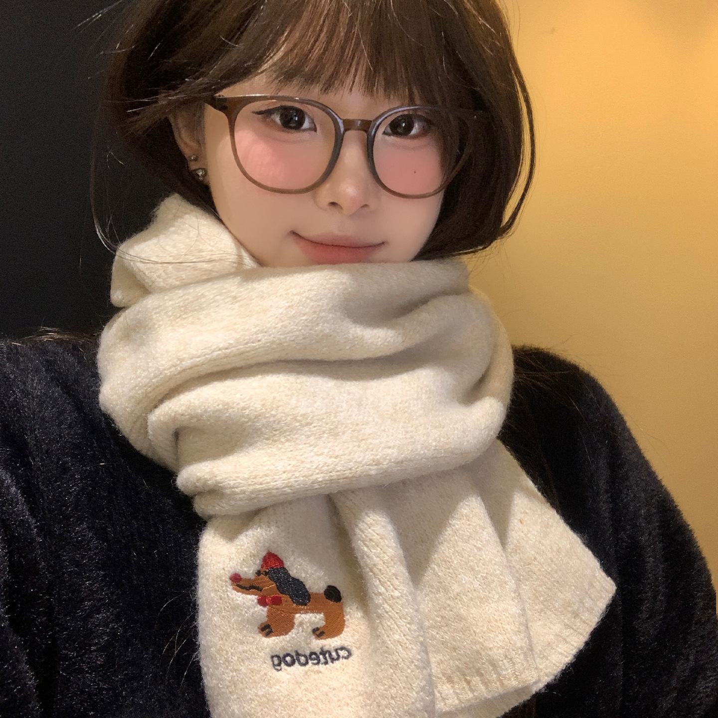日系のかわいい子犬の刺繍のマフラーの女性の秋の冬の2024の新型の保温の百合学院の風のメリヤスのマフラーの潮