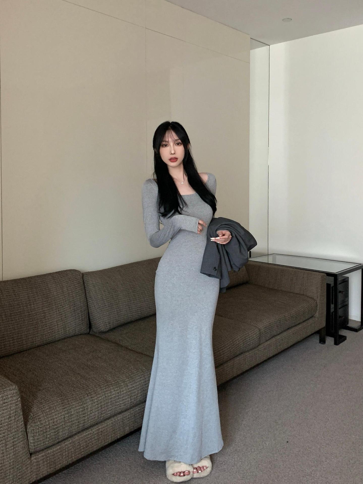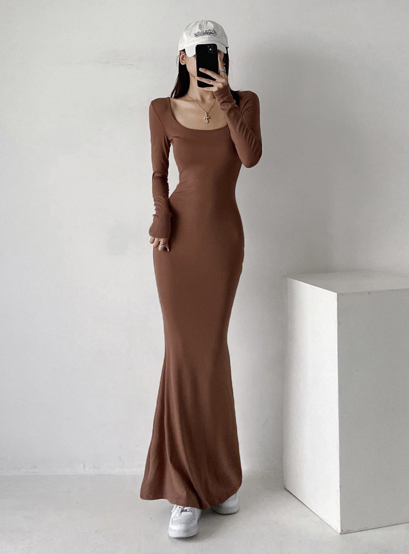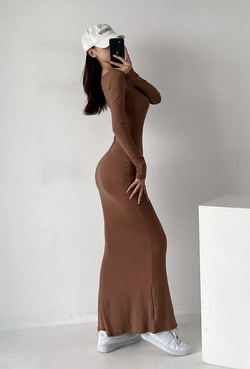 国際サイトのベーシック婦人服2026秋冬新作、おしゃれでシンプルなワンピース、足首まで届くスリムフィットのロングドレス