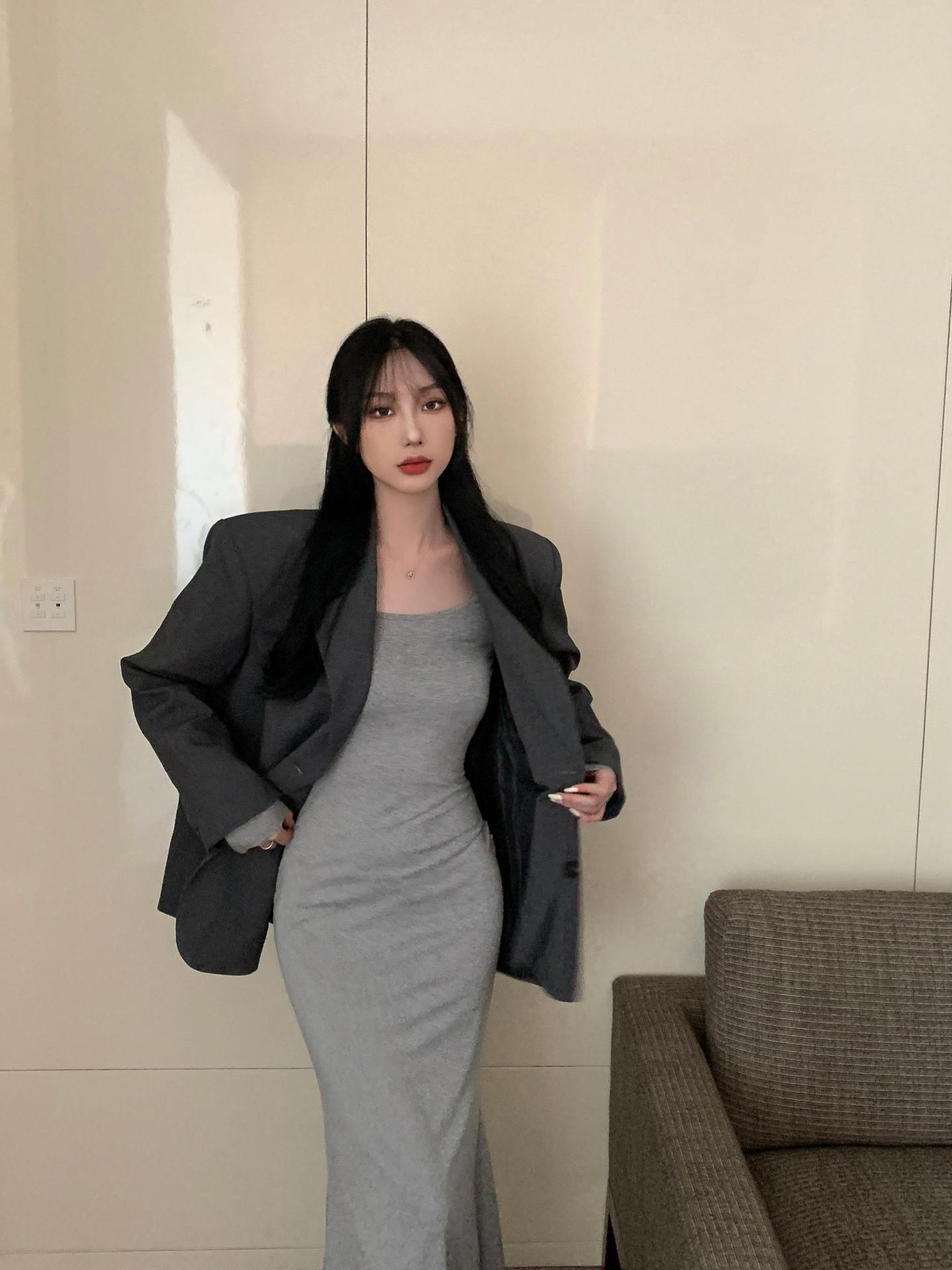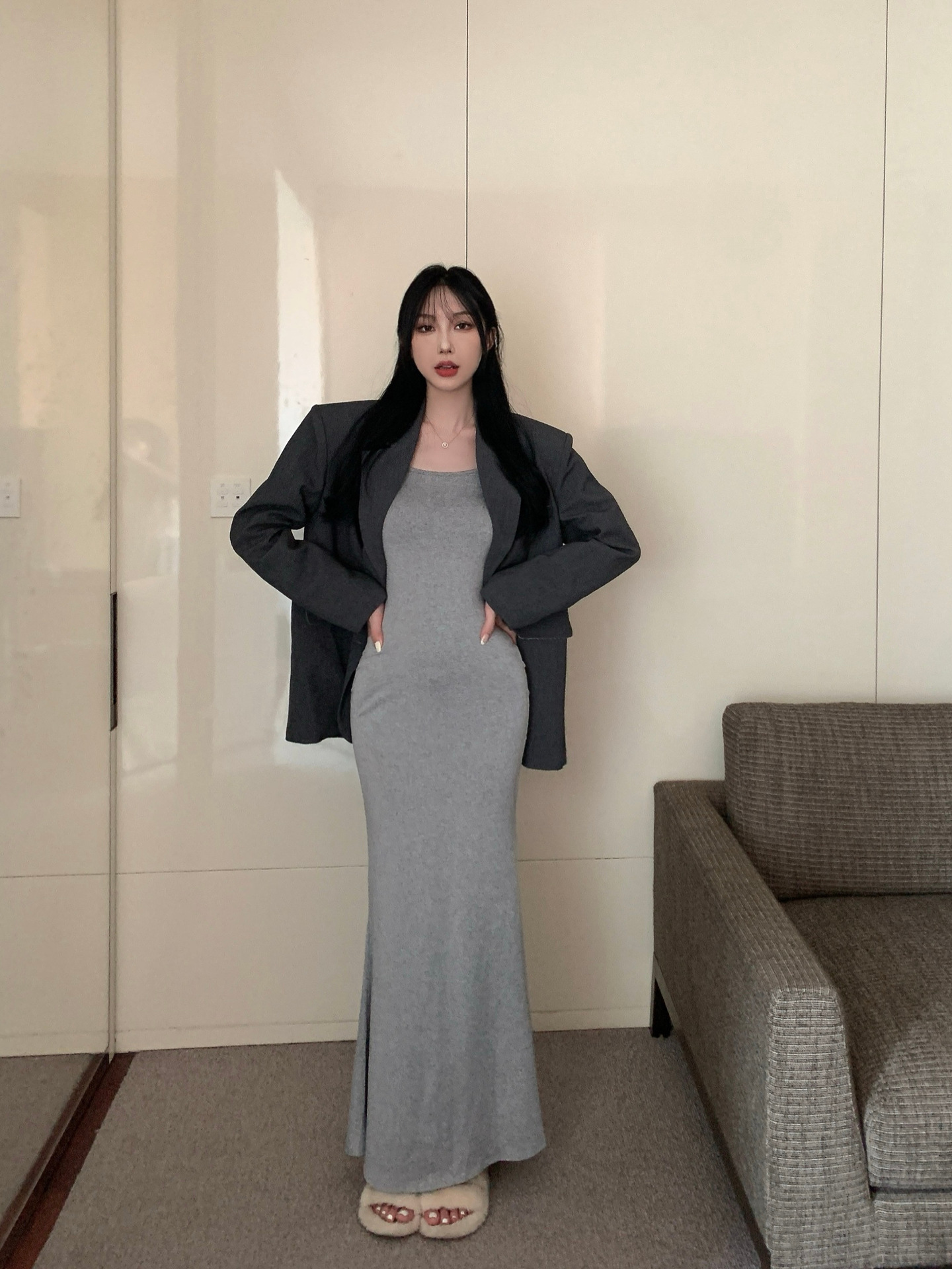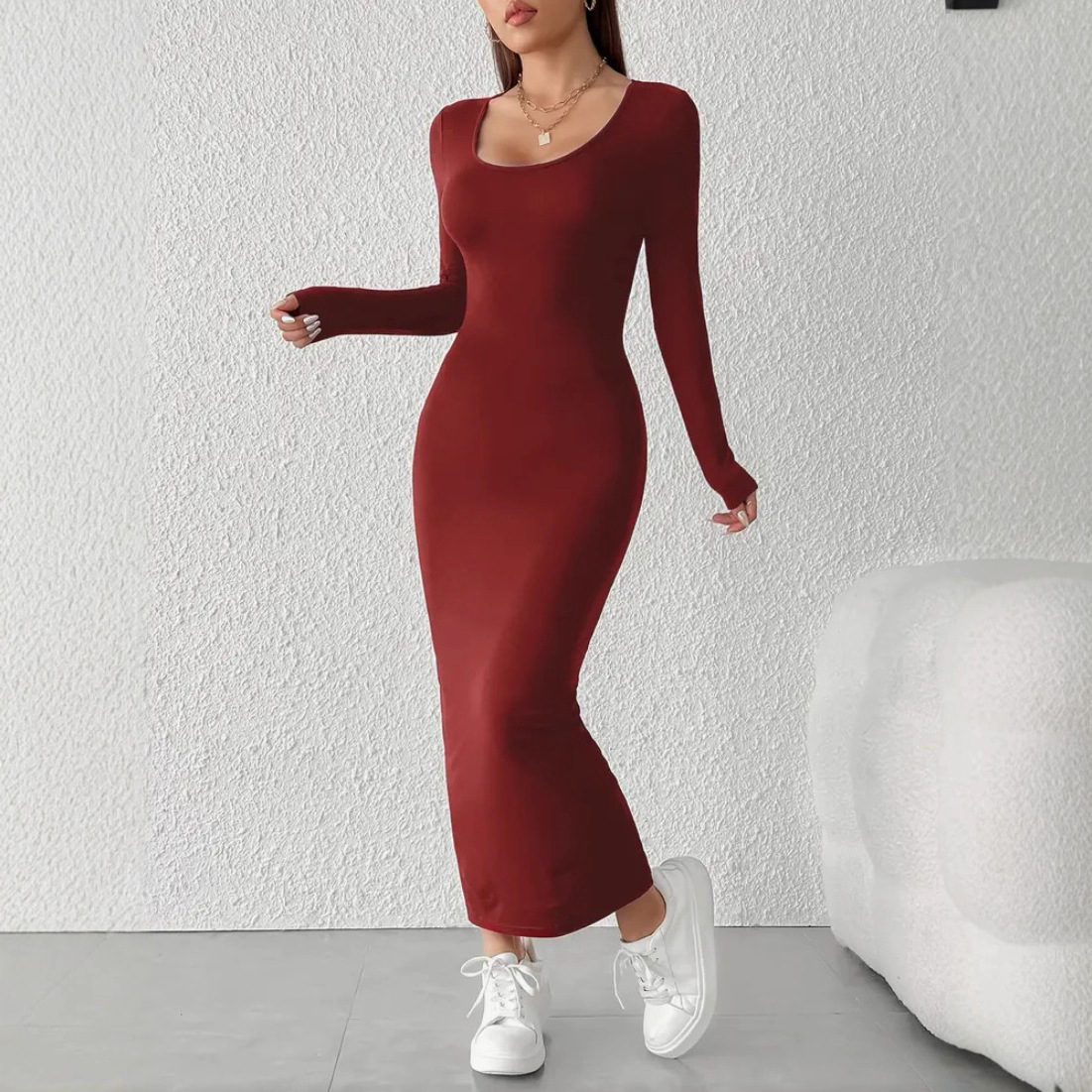 国際サイトのベーシック婦人服2026秋冬新作、おしゃれでシンプルなワンピース、足首まで届くスリムフィットのロングドレス