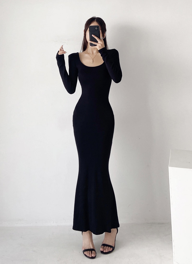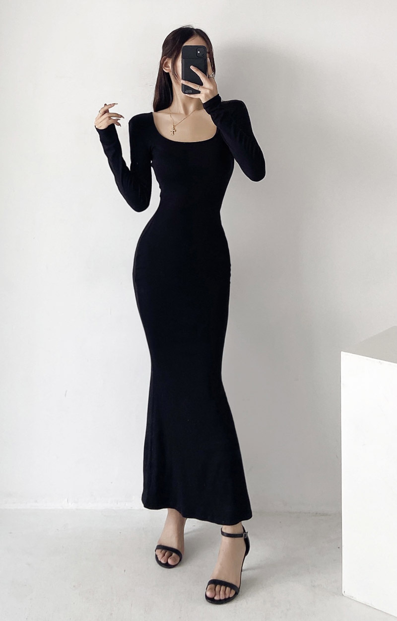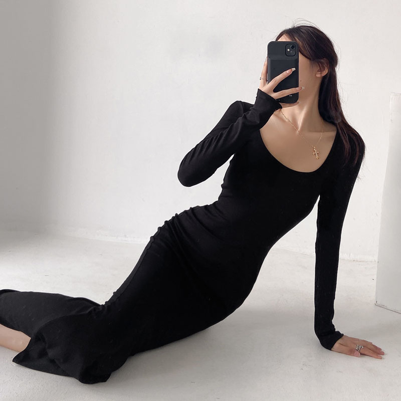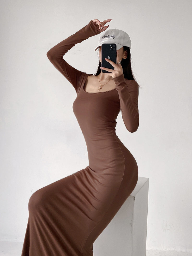 欧美风2025春秋女士修身长袖U领包臀长裙