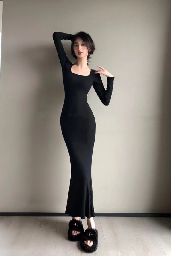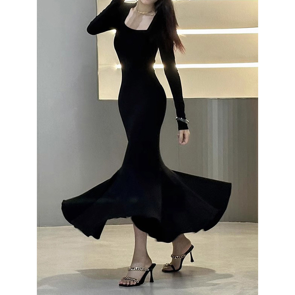 步步生莲鱼尾裙纯欲风辣妹修身纯色方领长袖包臀气质长裙连衣裙女