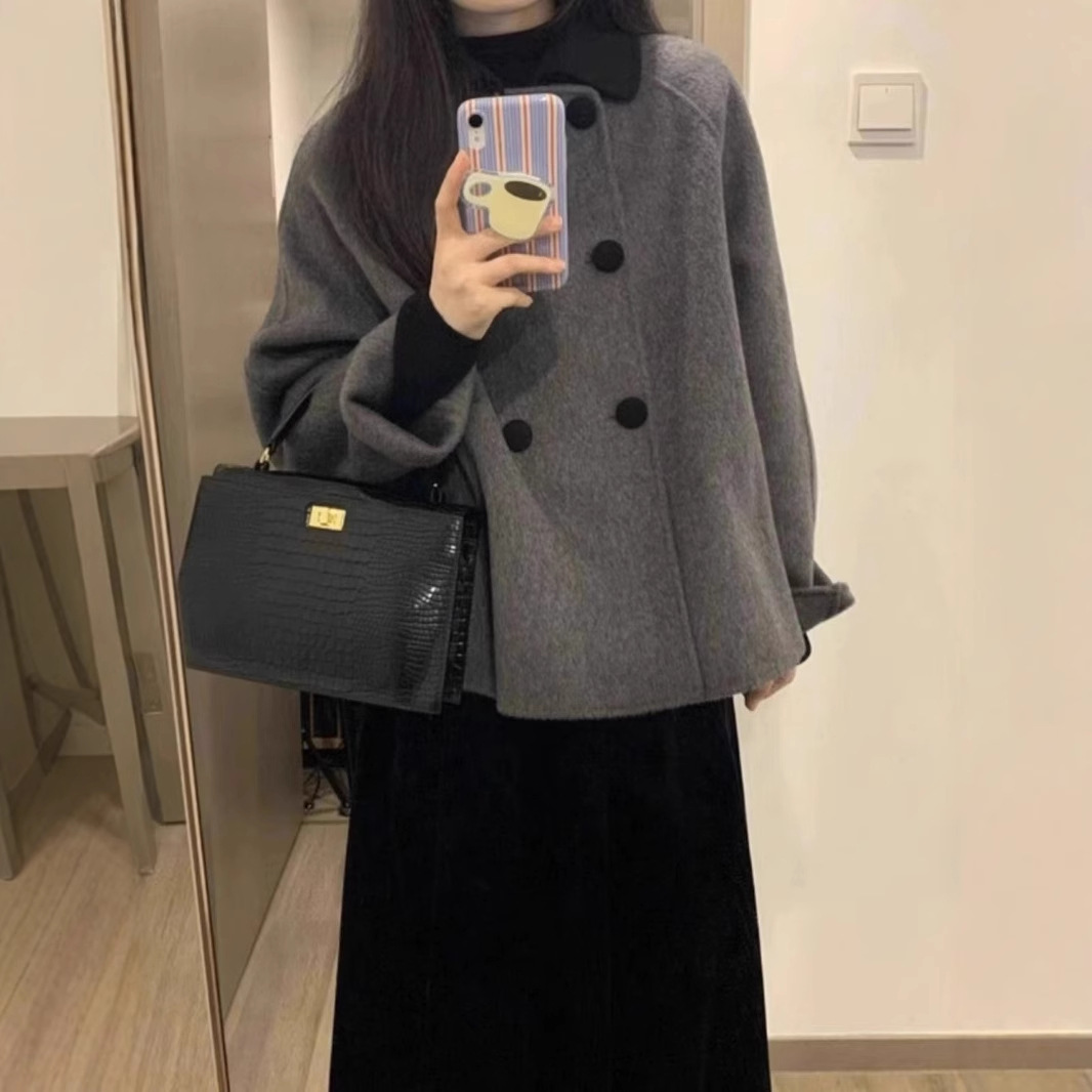女性用グレーショートウールコート、秋冬ベビードールカラー、レトロな厚みのある韓国ヘボンスタイルのウールコート