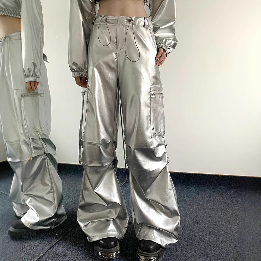 秋の格好いい銀色の工装ズボンの女性の大きいポケットのデザイン感のカジュアルなズボンはひもを引きます。