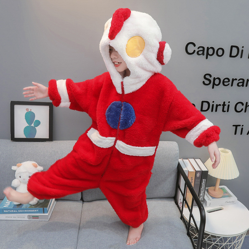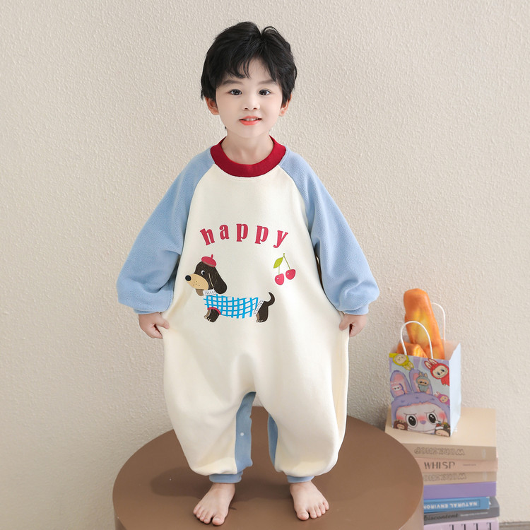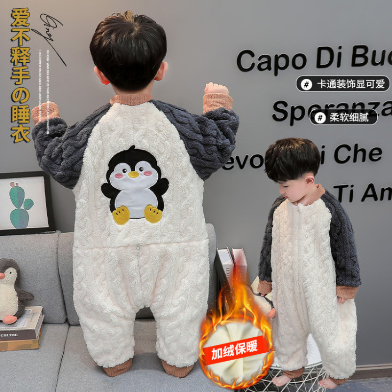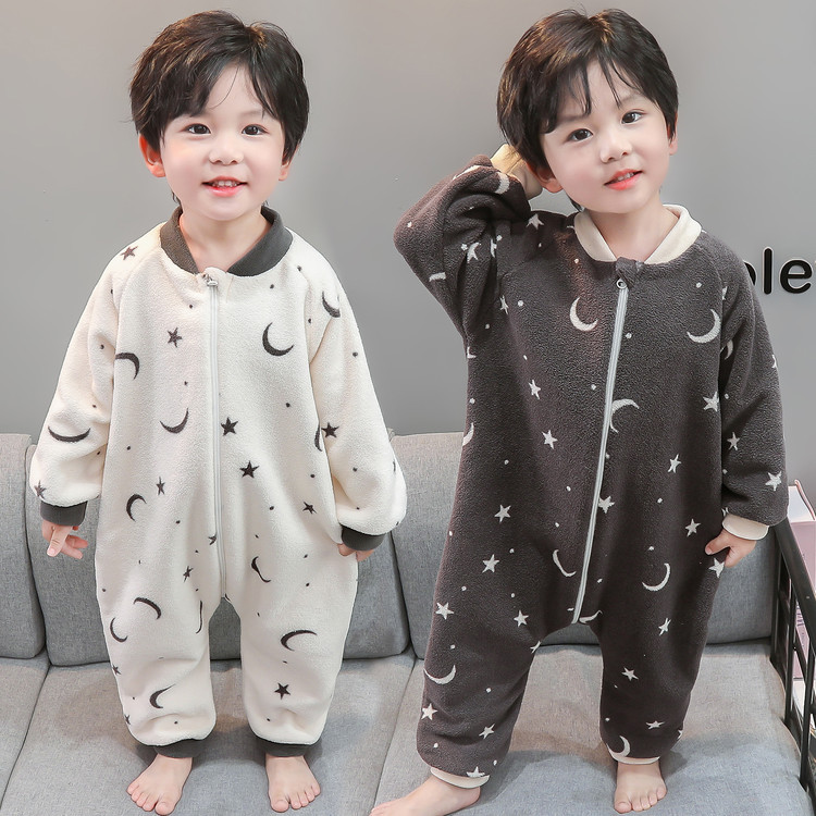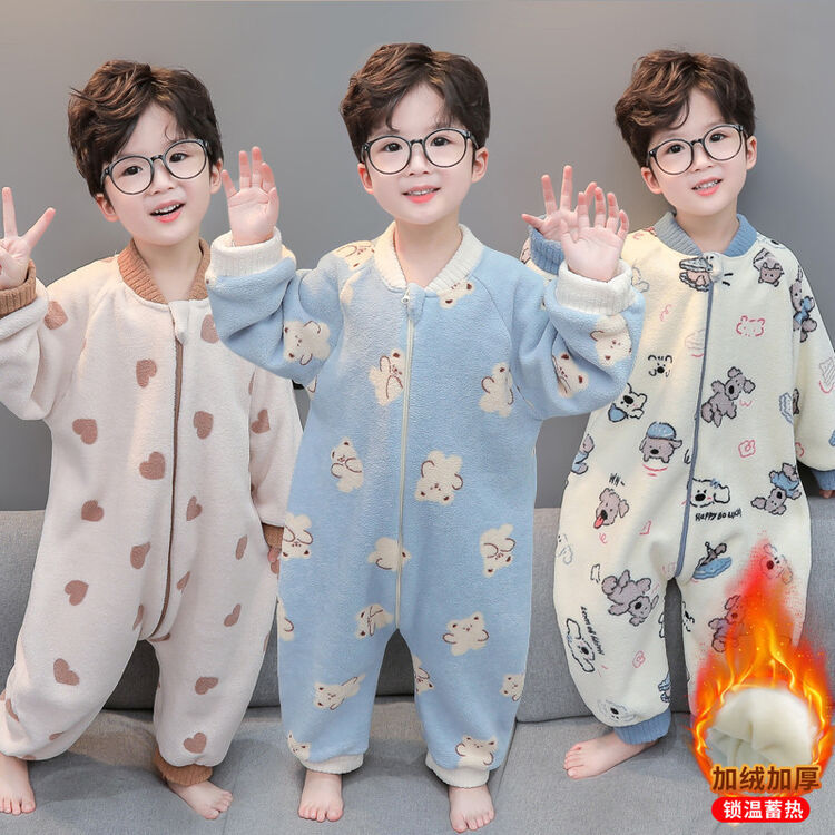 秋冬儿童法兰绒分腿睡袋加绒加厚男童珊瑚绒睡衣连体衣保暖家居服
