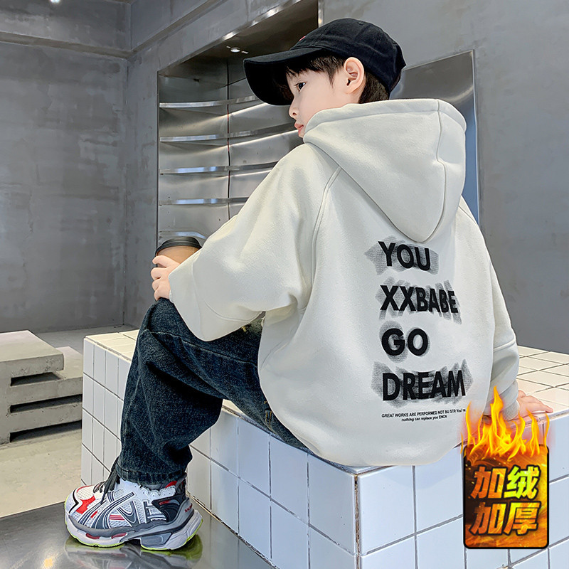 男の子用フード付き裏起毛スウェットシャツ、2024年秋冬新作、子供用冬服、中高生向けインナーシャツ、厚手でスタイリッシュな子供服