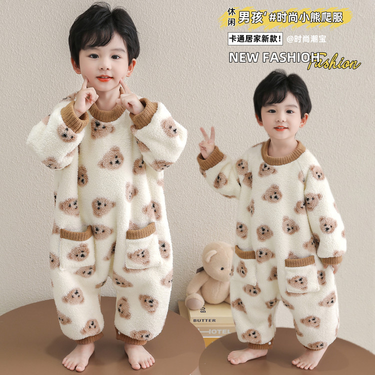 男児フランネルパジャマ秋冬金2024新型男の子赤ちゃん冬サンゴパイルは子供の家服を厚くする