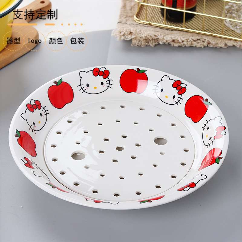 可爱陶瓷双层盘带沥水架卡通蒸饺盘家用水果盘蒸箱适用蒸盘