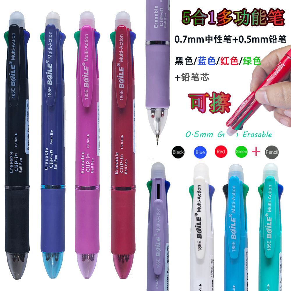 クロスボーダー5合1可拭中性ペン押し式黒色学生文房具多機能筆記0.7mm事務用具