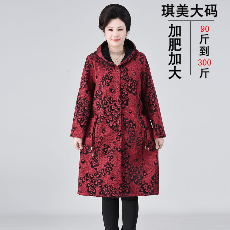 200斤の大きいサイズの長いコートの高級な女性の風衣の太ったお母さんのベルベットは膝の中高年のお母さんのコートを厚くします。