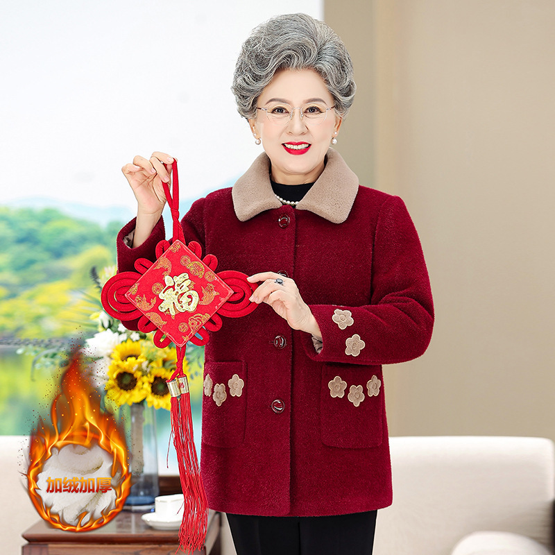 2024高齢者の冬服の新しいお母さんの毛は上着のおばあさんとベルベットの厚い服の50歳の60格子コートです