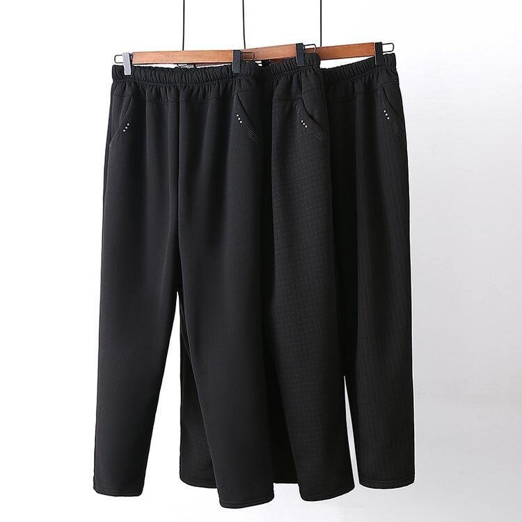 中高年のお母さんのズボンの秋冬のタイプの厚いカジュアルなズボンはゆったりしていて、やせています。