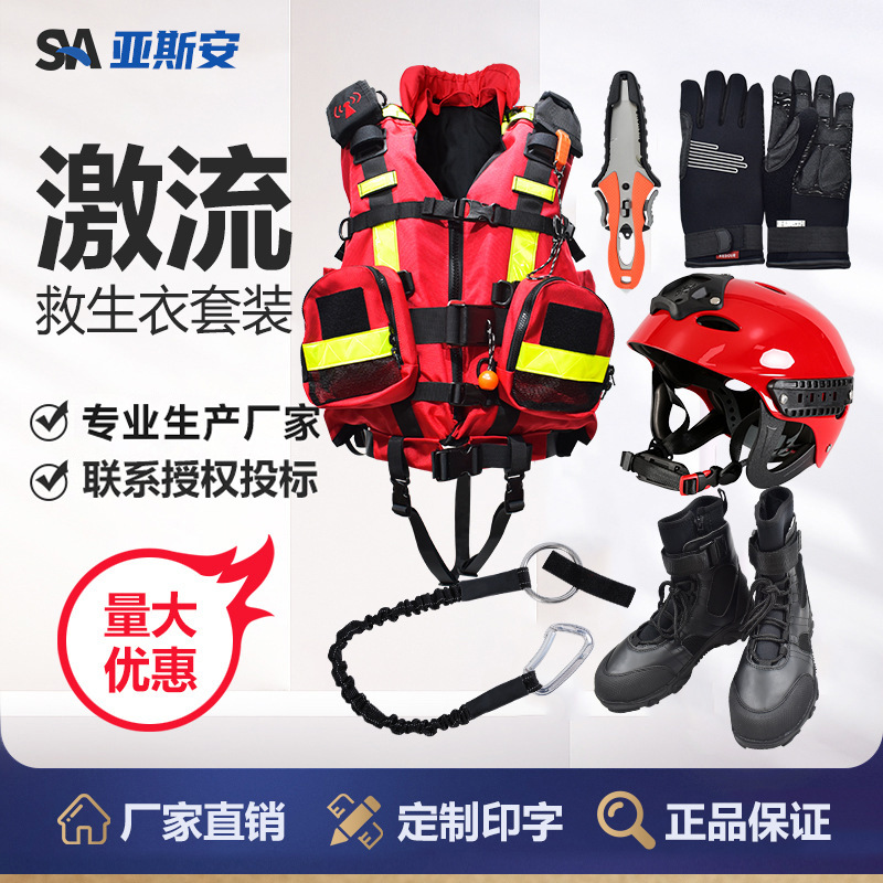 アスアン重激流救命服セット水域救助ヘルメット牛尾ロープナイフブーツ手袋救命装備