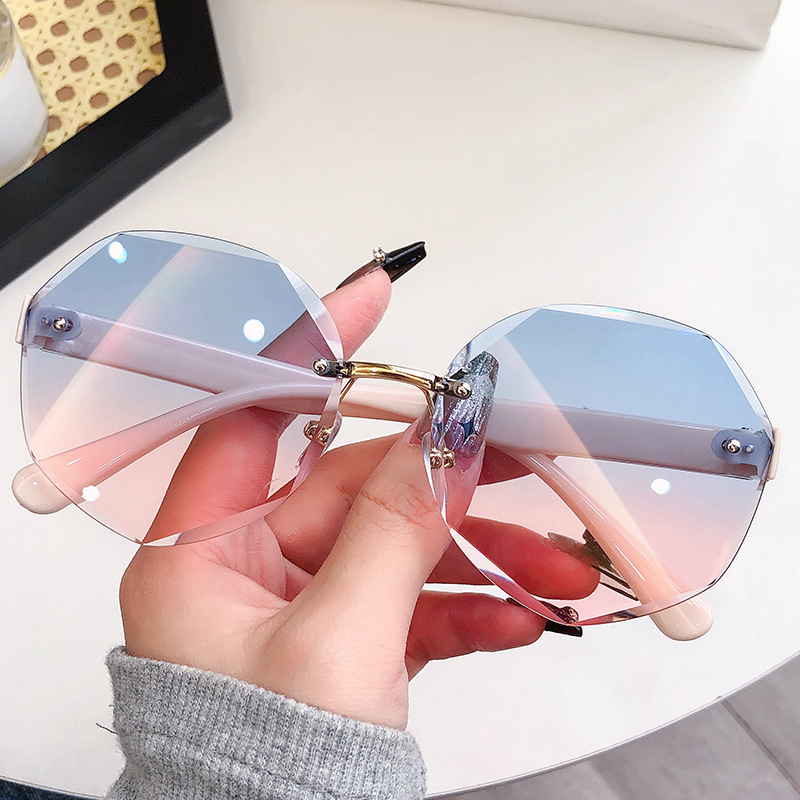 新しいファッションの縁なしサングラス女性のファッションは不規則な枠のサングラスの街で紫外線防止メガネを撮ります。