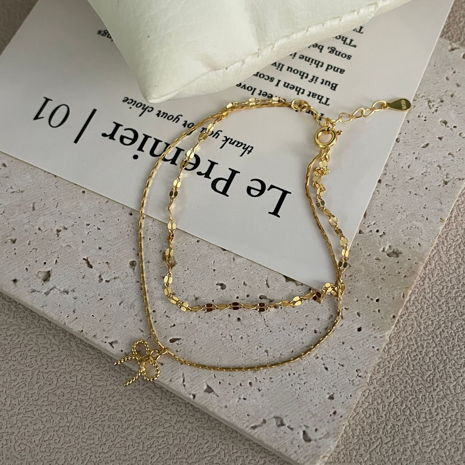 サイナ小衆レトロS925純銀蝶結び二重ブレスレット女性シンプルな基礎スタイルの質感唇チェーン