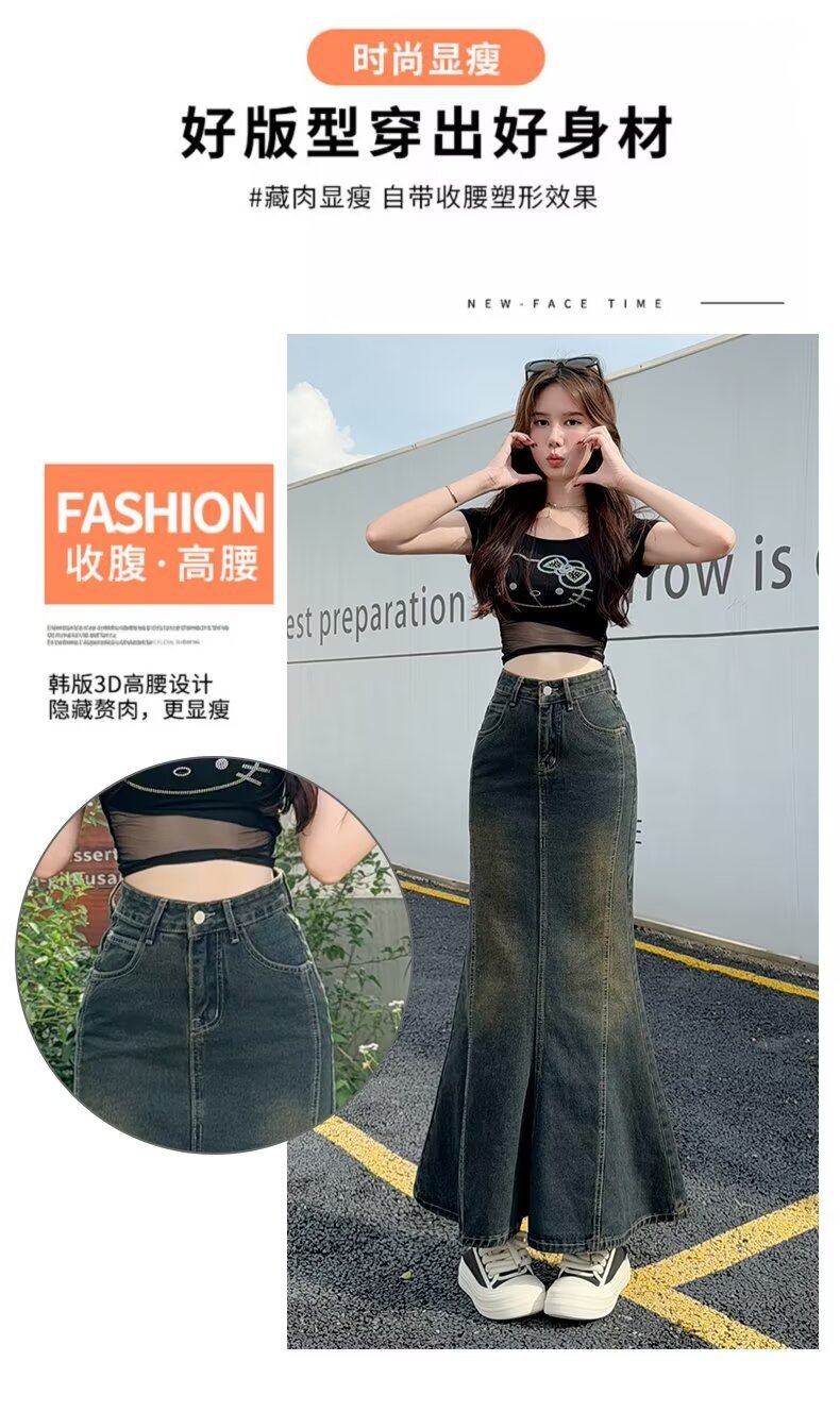 広州供給アメリカンレトロデニムスカートレディースハイウエストスリムミドル丈Aラインヒップカバーフィッシュテールスカート