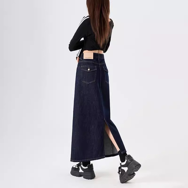 深蓝色丹宁牛仔半身裙长款女春秋2025新款高腰弹力a字直筒一步裙