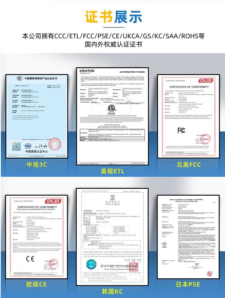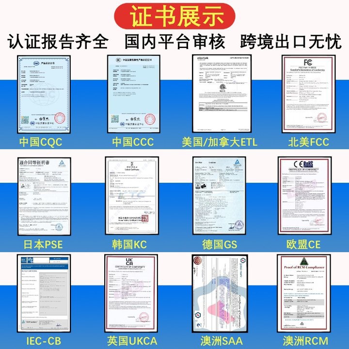 CCC/CQC認証,米国ETL/FCC認証,日本のPSE認証,韓国のKC/KCC認証,欧州GS/CE認証,英国規制 UKCA/CE 認証,オーストラリアの規制 SAA 認証,ロシアのETL認証