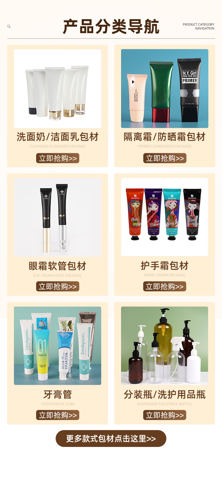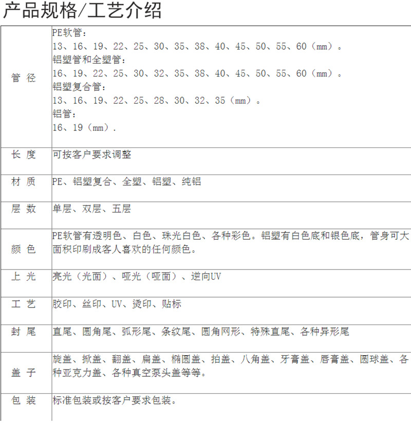 ハンドクリーム、ソフトチューブ、洗顔料、スクイーズ式二腔チューブ、PEプラスチックコンディショナー、ボディローション、スキンケア包装材