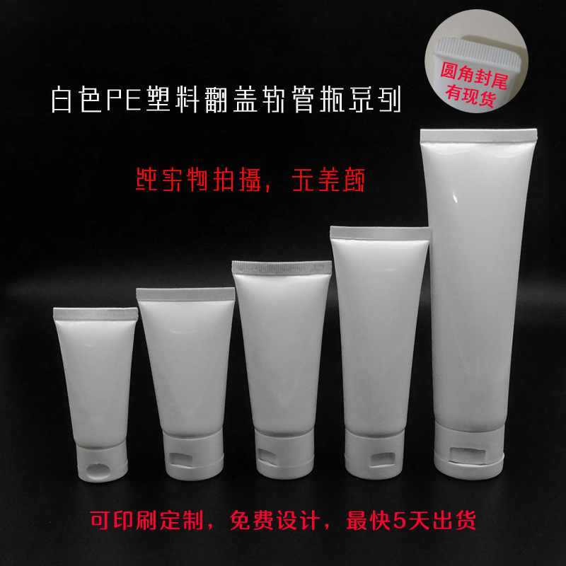 白色PEプラスチック製化粧品軟管ボトル、フリップキャップ付き、在庫あり、小ロット印刷、ロゴ印刷対応、100個から