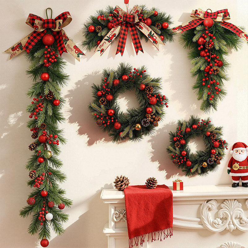 2025圣诞节装饰品松果花环门挂圣诞树雪松针红浆果藤条圈商场布置