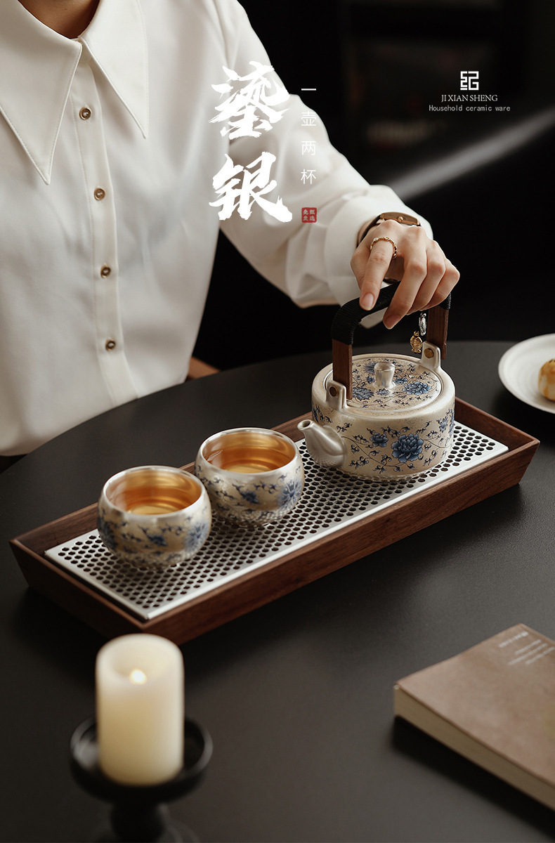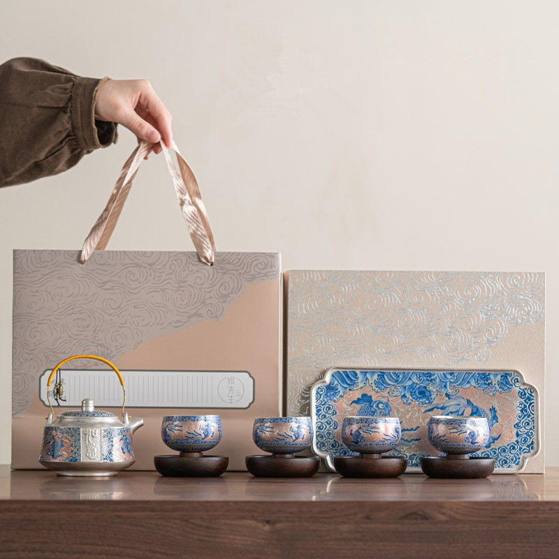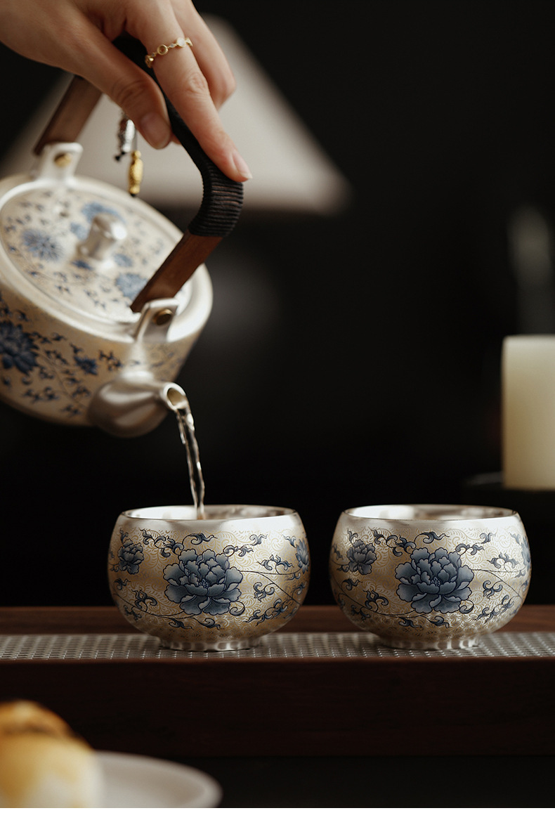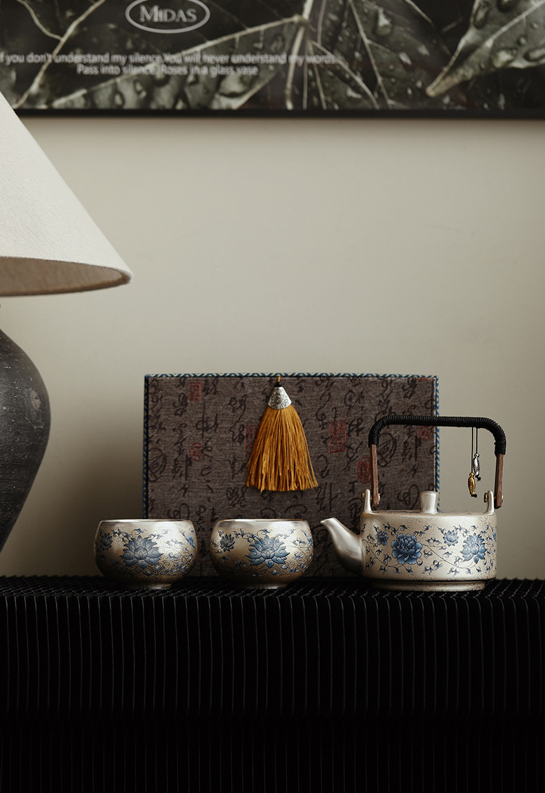 -(ゴールド)金銀巻き蓮ティーポット、ポット1個、カップ2個(ギフトボックス)
