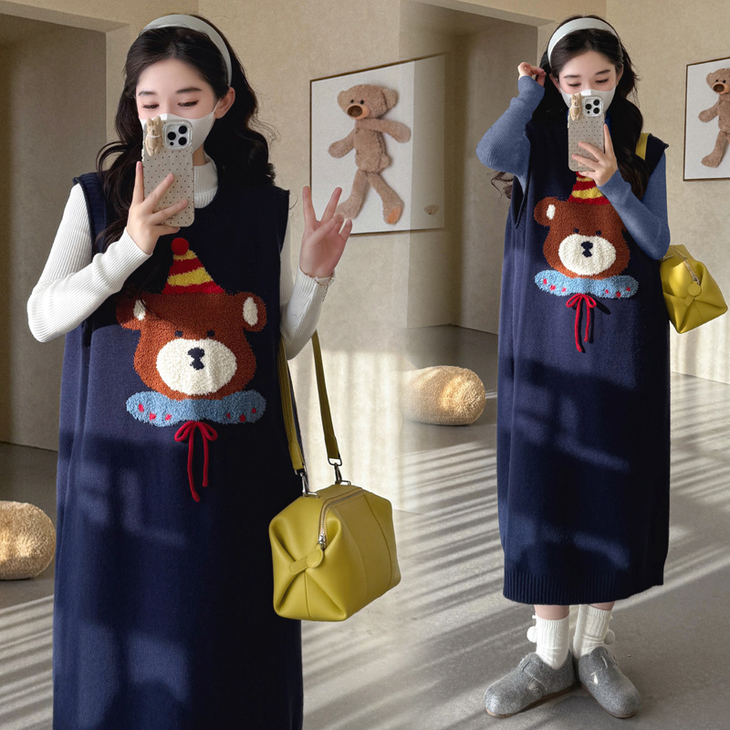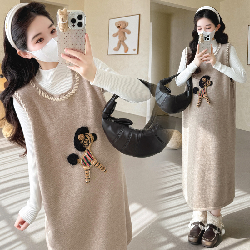 2025秋冬新款网红款减龄卡通中长款马甲裙+半高领打底衫孕妇套装
