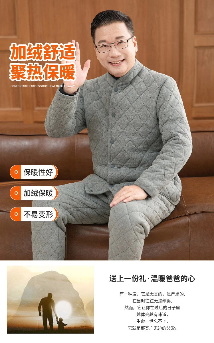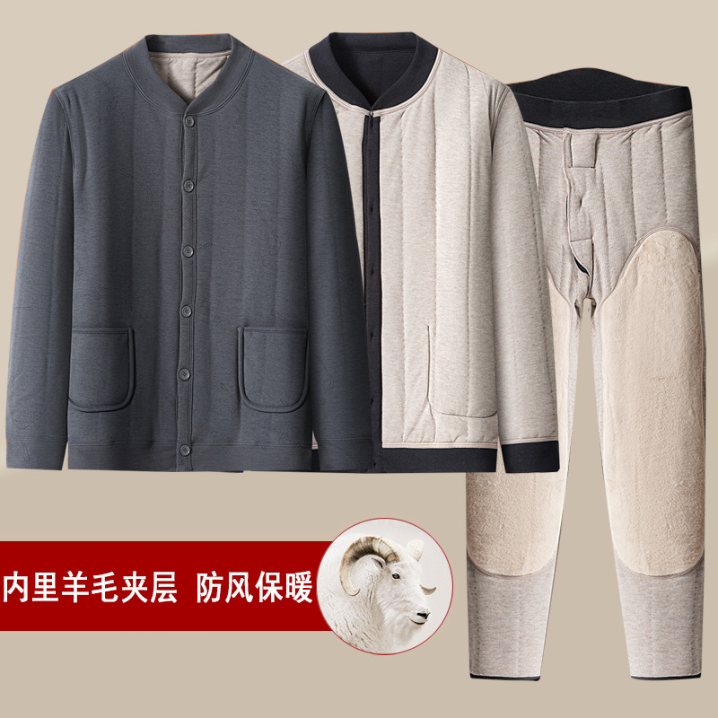 爸爸冬季三层绵羊毛保暖内衣男士加绒加厚防寒中高领保暖棉衣棉裤