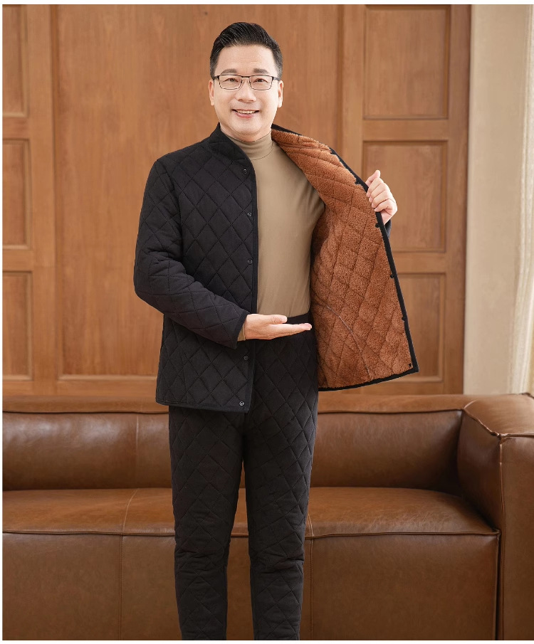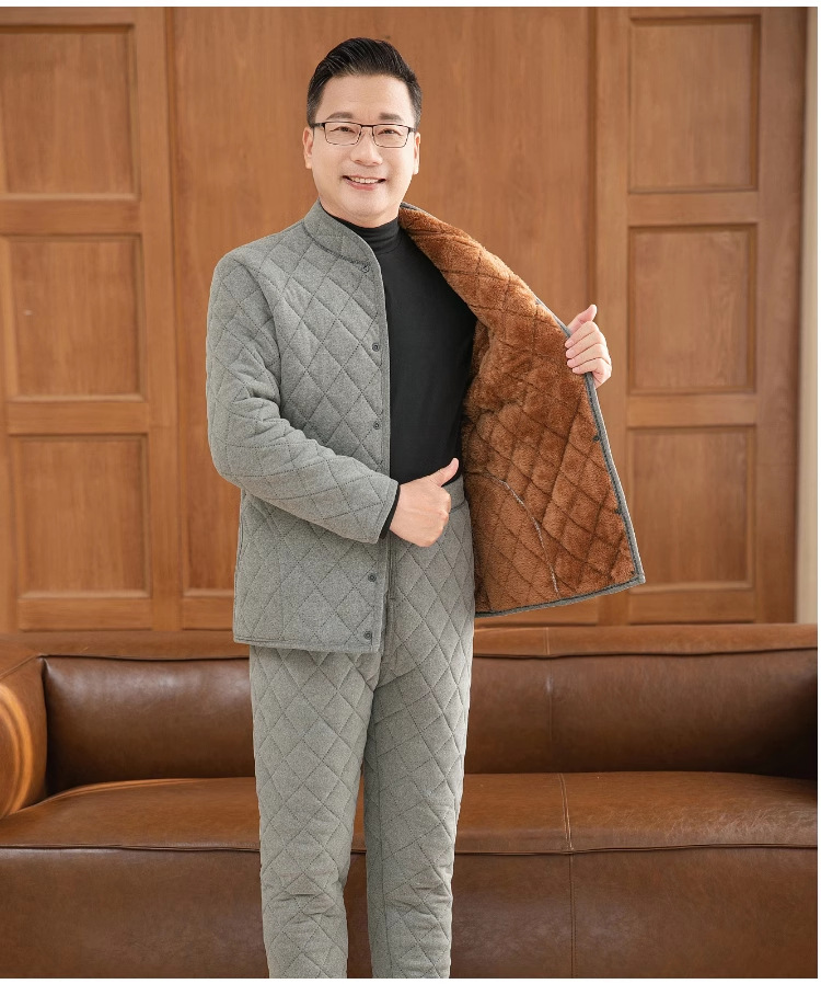 おじいさんは厚いベルベットの保温下着男性のカーディガンの中で高齢者の冬にベルベットのお父さんの綿入れのズボンのスーツを着ています