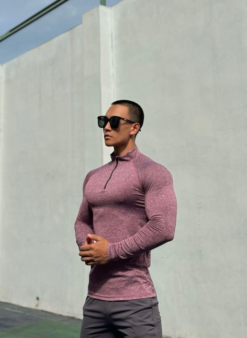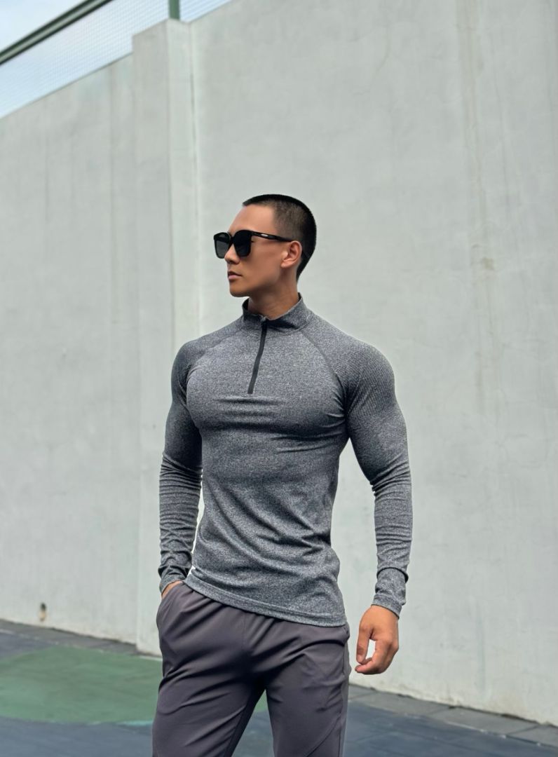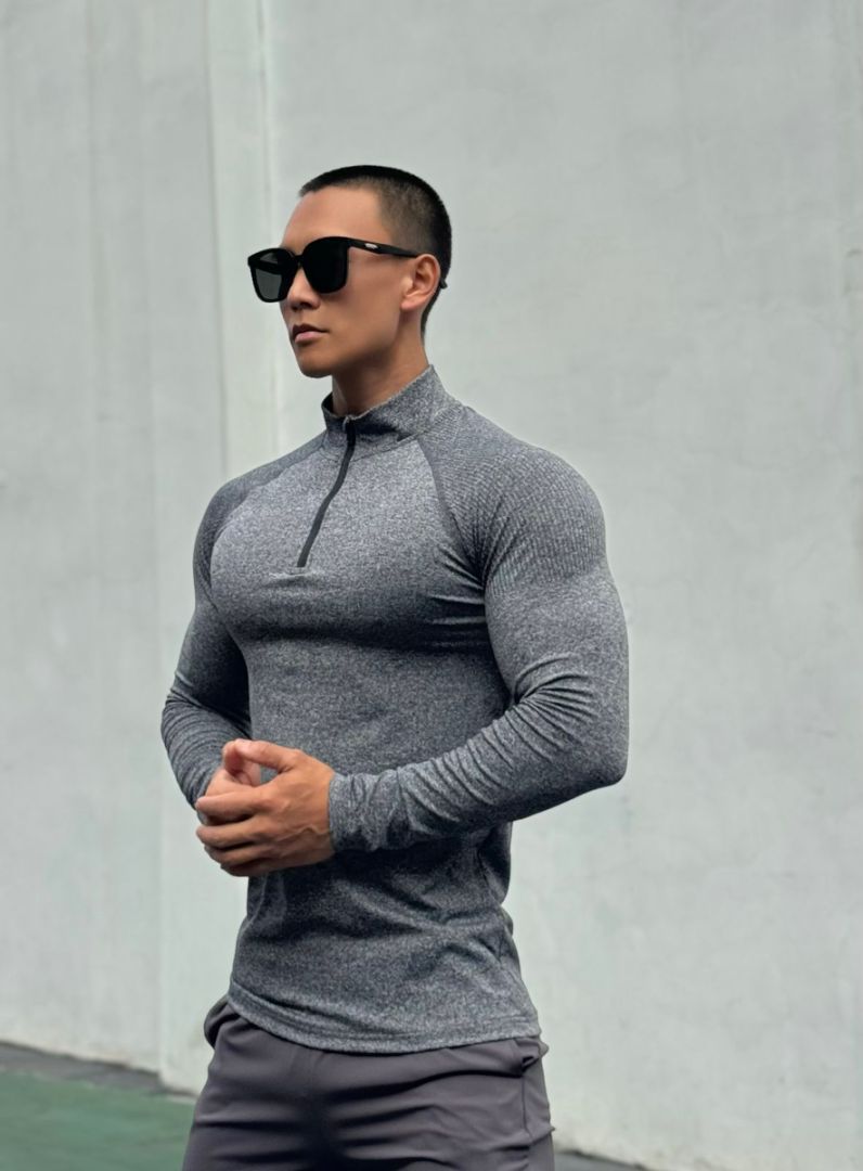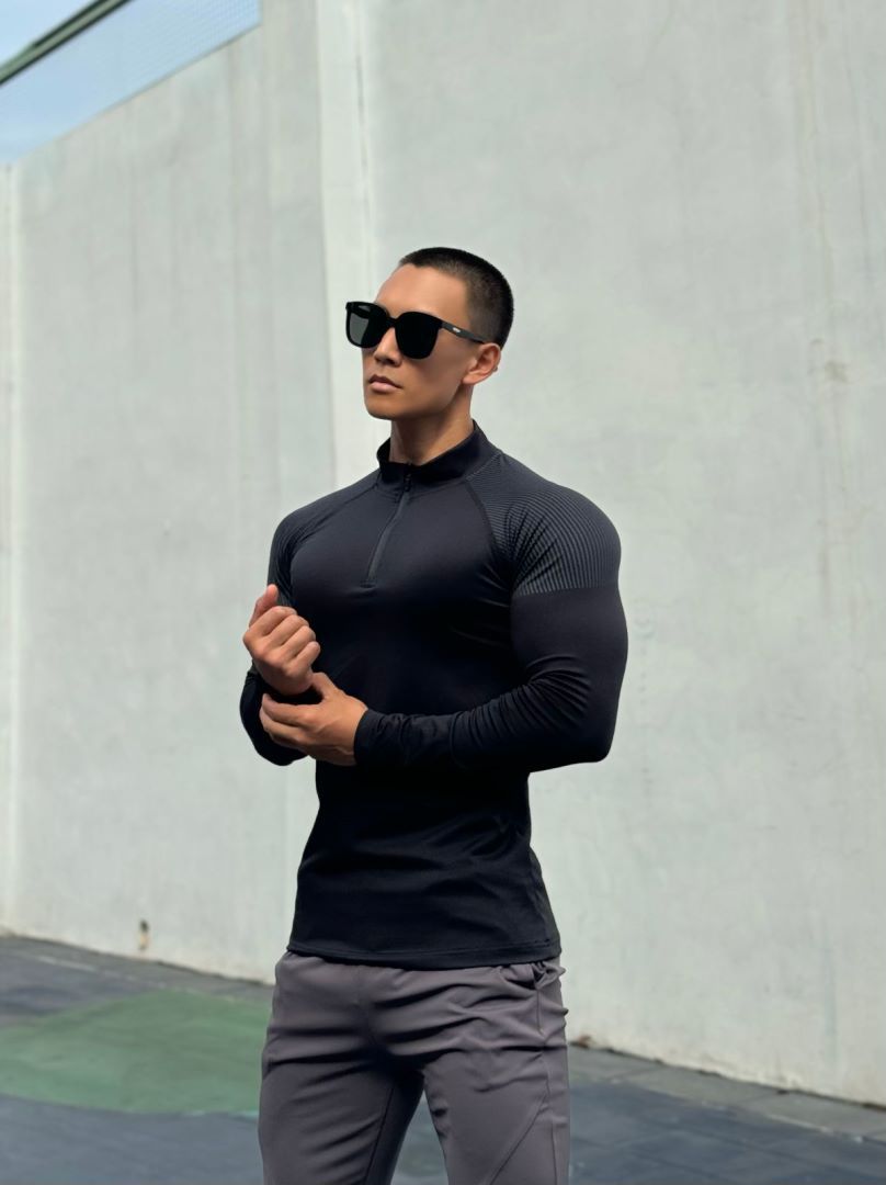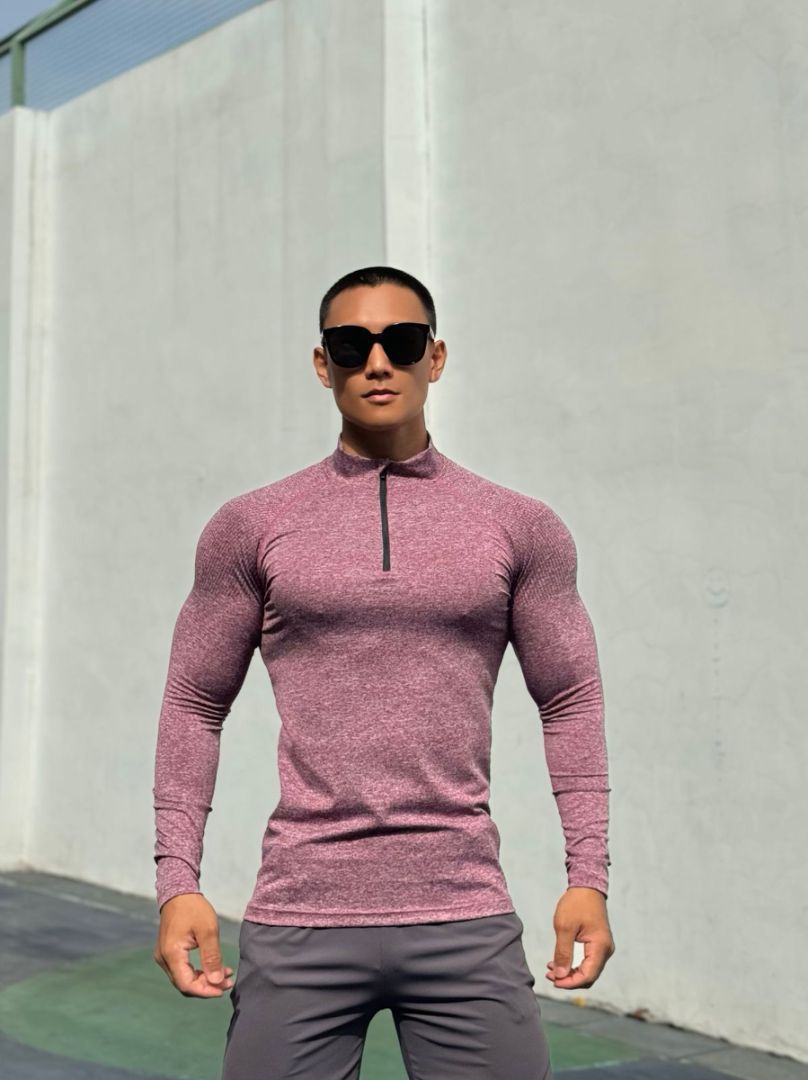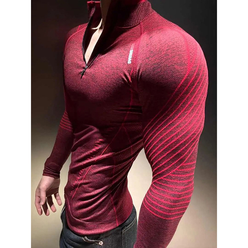 秋季无缝显大健身衣弹力速干运动半拉链长袖透气修身训练服上衣男
