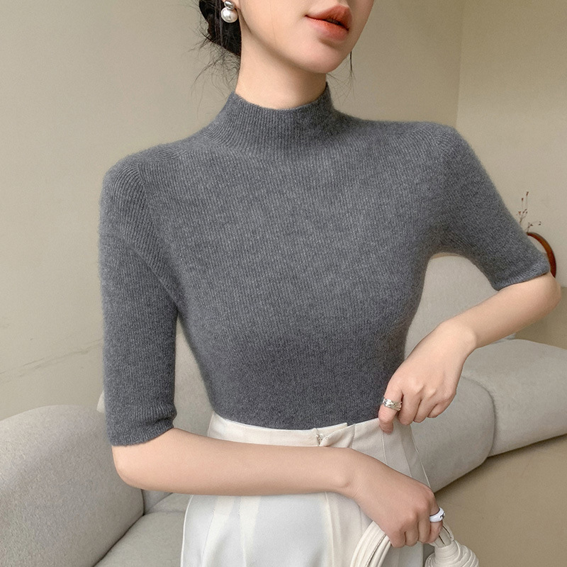 女性用ハーフタートルネック五分袖セーター、スリムフィットセーター、ミッドスリーブインナーニットクロスボーダーレディースボトリングシャツ