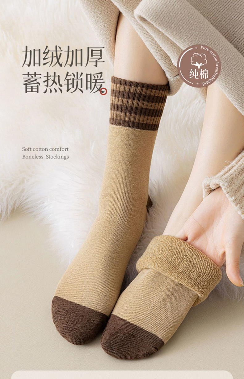 爆款女士秋冬季加绒加厚中筒袜 蓄热保暖女士休闲条纹地板毛圈袜