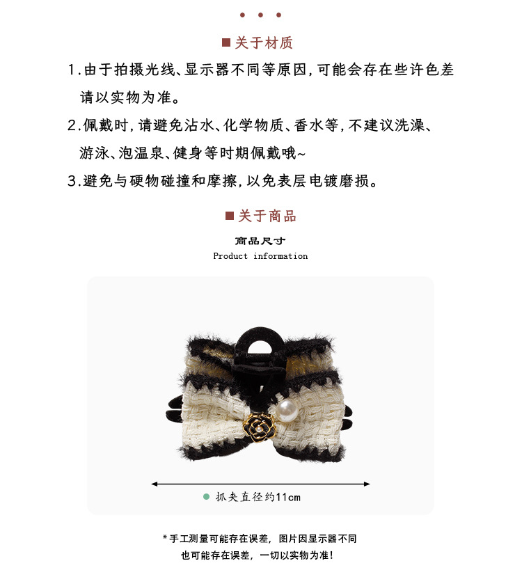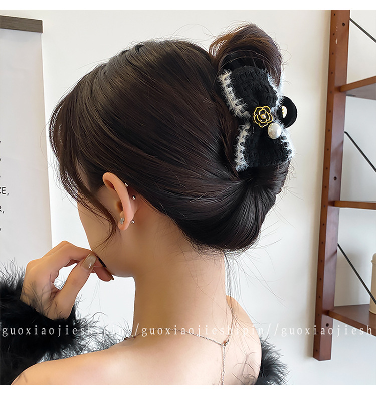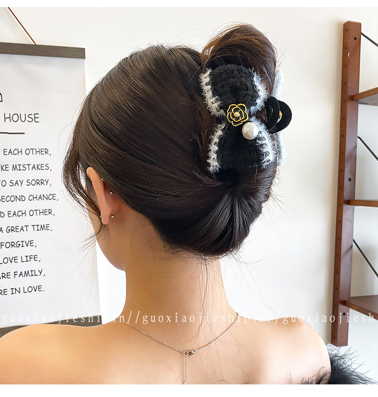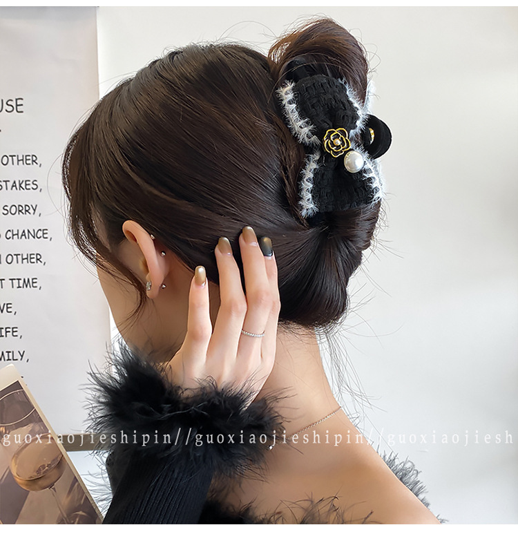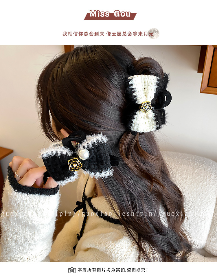秋冬新款抓夹气质轻奢小香风蝴蝶结发夹毛绒高级发饰山茶花鲨鱼夹