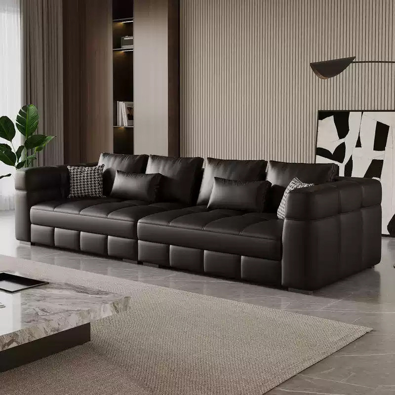 イタリア風ミニマリスト大型黒牛革ソファ、セミグリーンレザーソファ、リビングルーム用高級ソファ、広東佛山製本革ソファ