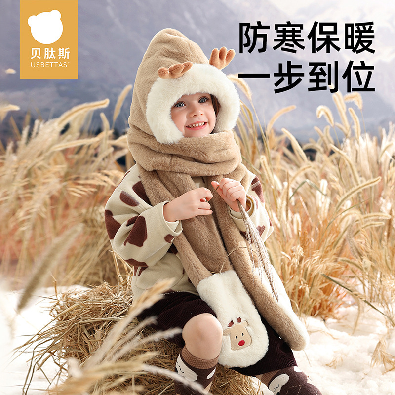 ペプチスベビー帽子子供用マフラー一体キャップ秋冬赤ちゃん耳当てキャップ冬の外出保温防風キャップ