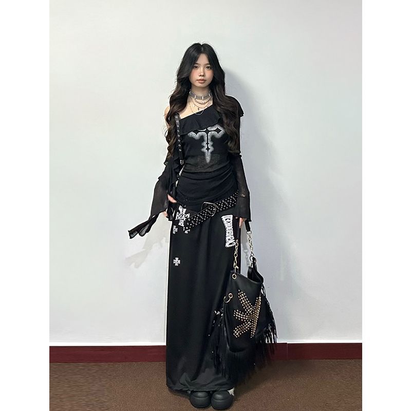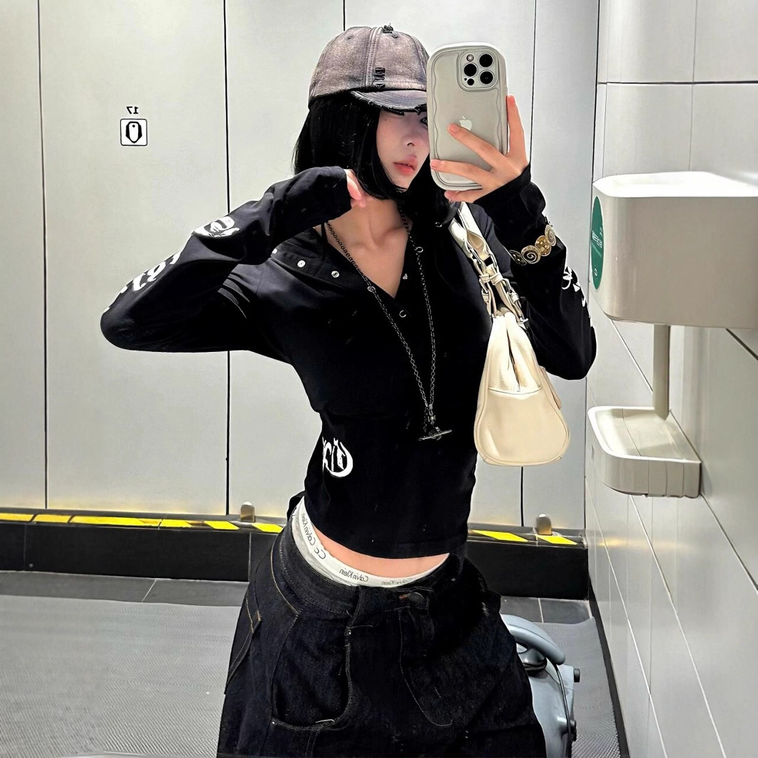 暗黒亜比y 2kの肩の日焼け止めの上着の女性2025夏の新型の亜文化の復古の十字の長袖のtシャツ