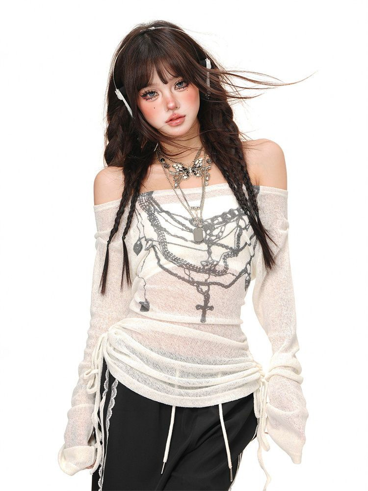 【オリジナル生地】プリント一字肩tシャツ女性微透長袖日焼け止めブラウスひもひも上着白