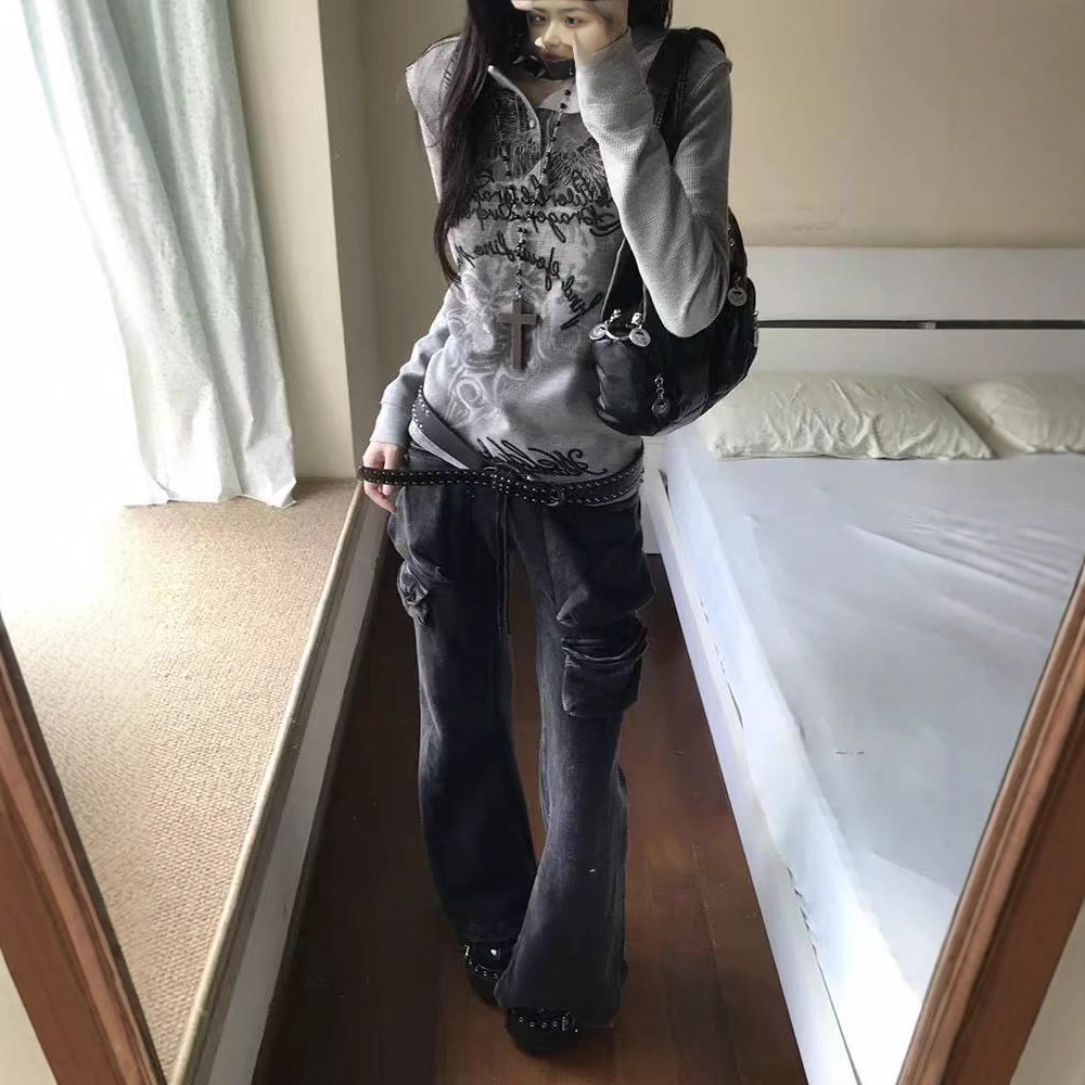 アメリカのレトロな灰色の長袖の女性の秋のロックバンドプリントジッパーのカーディガンのコートy2k亜文化の上着