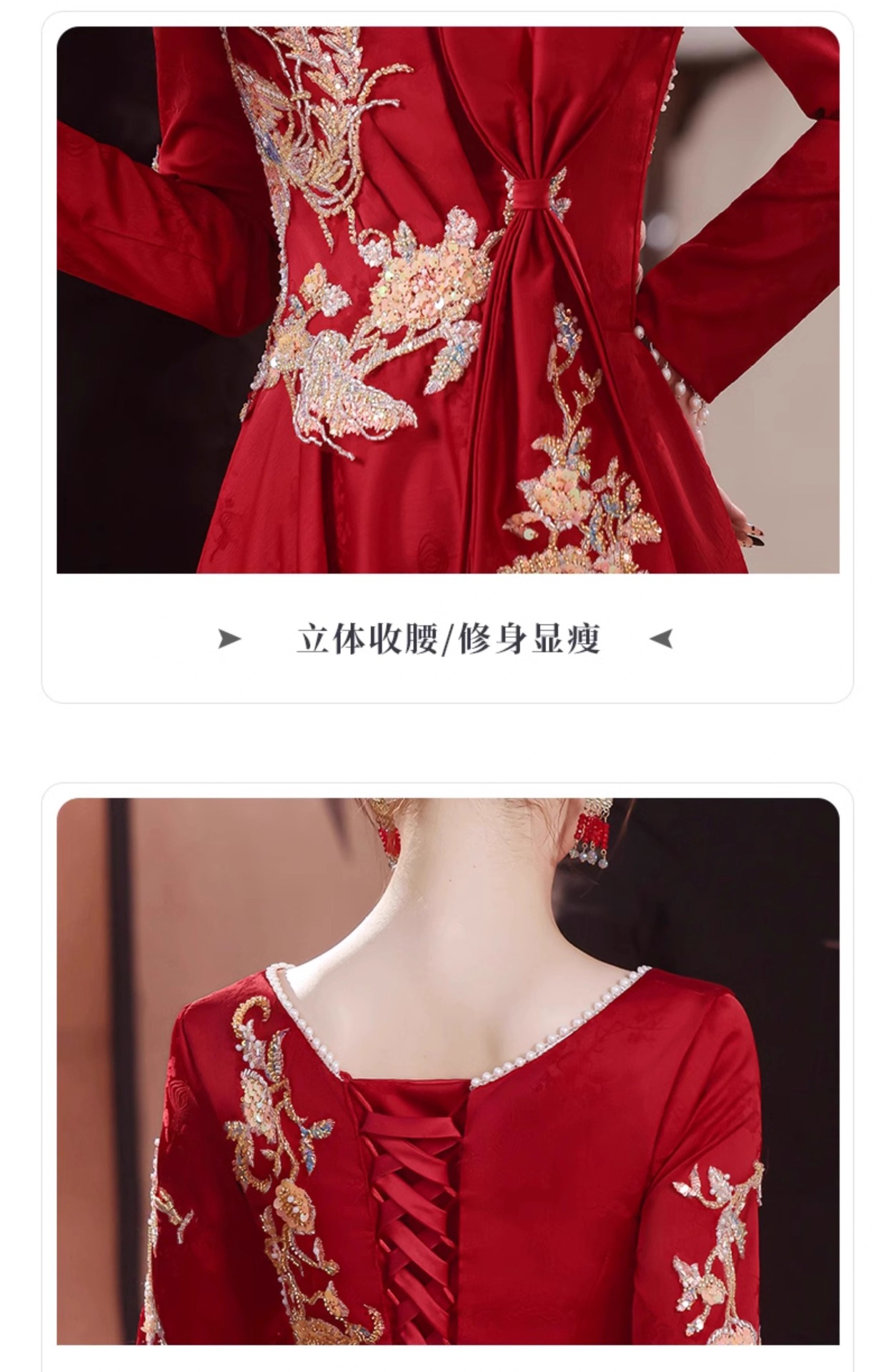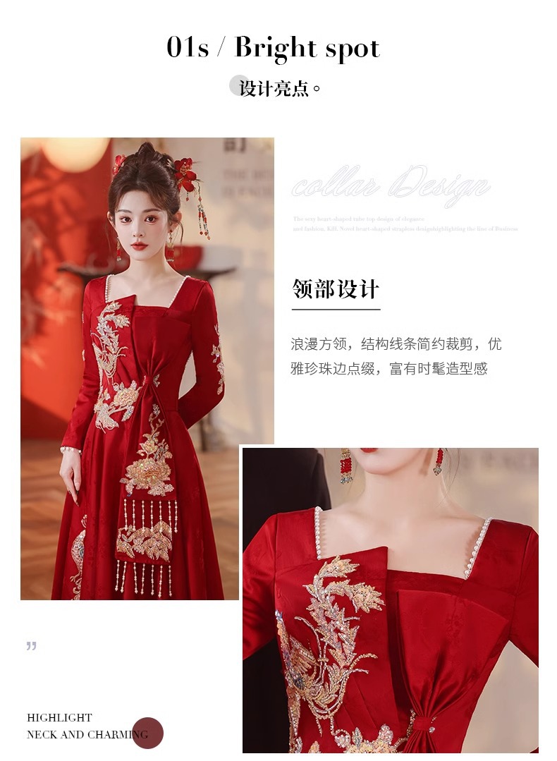 春の高級感あふれる赤いウェディングドレス、新婦の帰省や婚約式用のドレス、新作中国風長袖ドレス