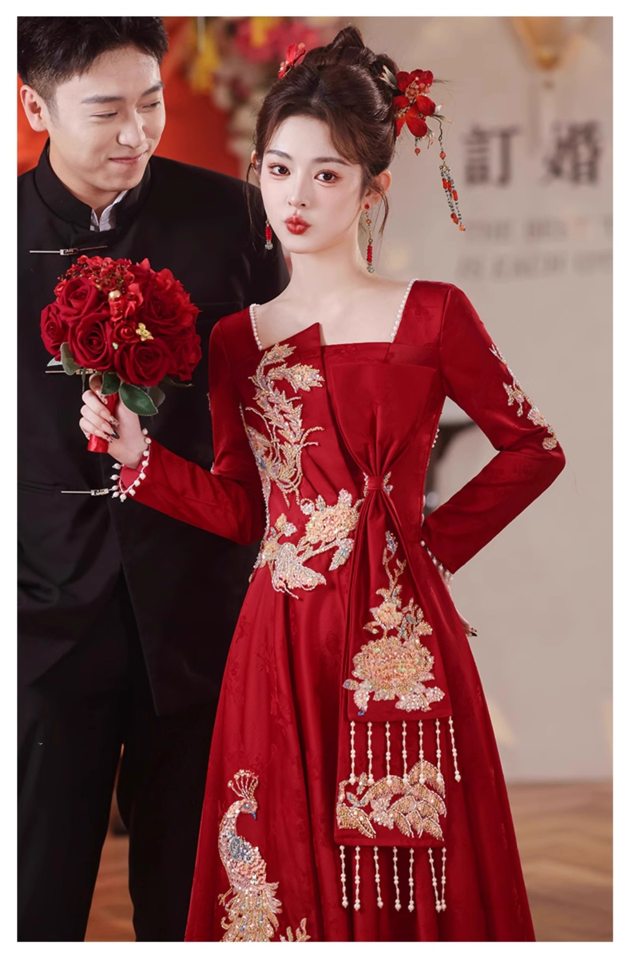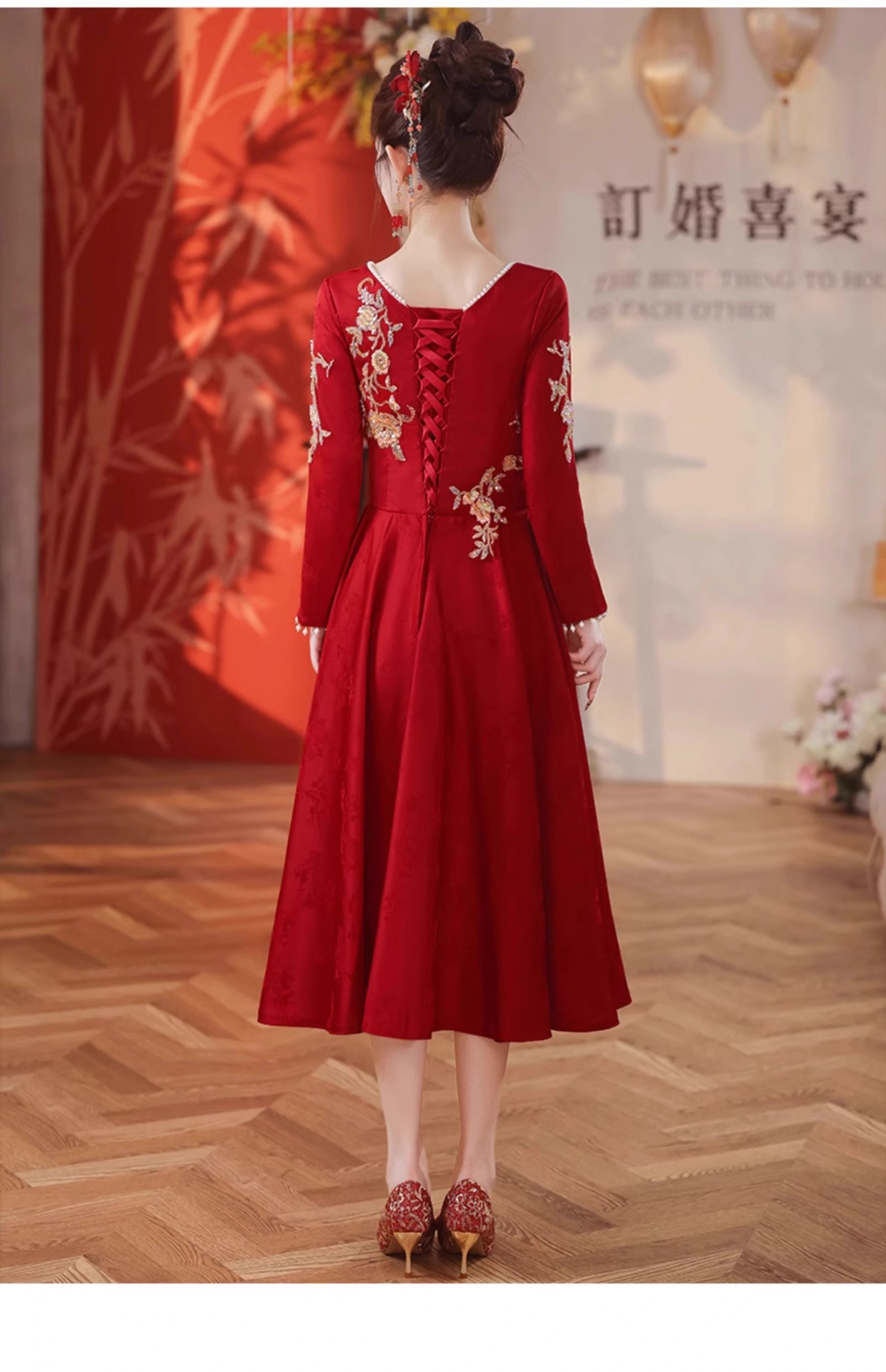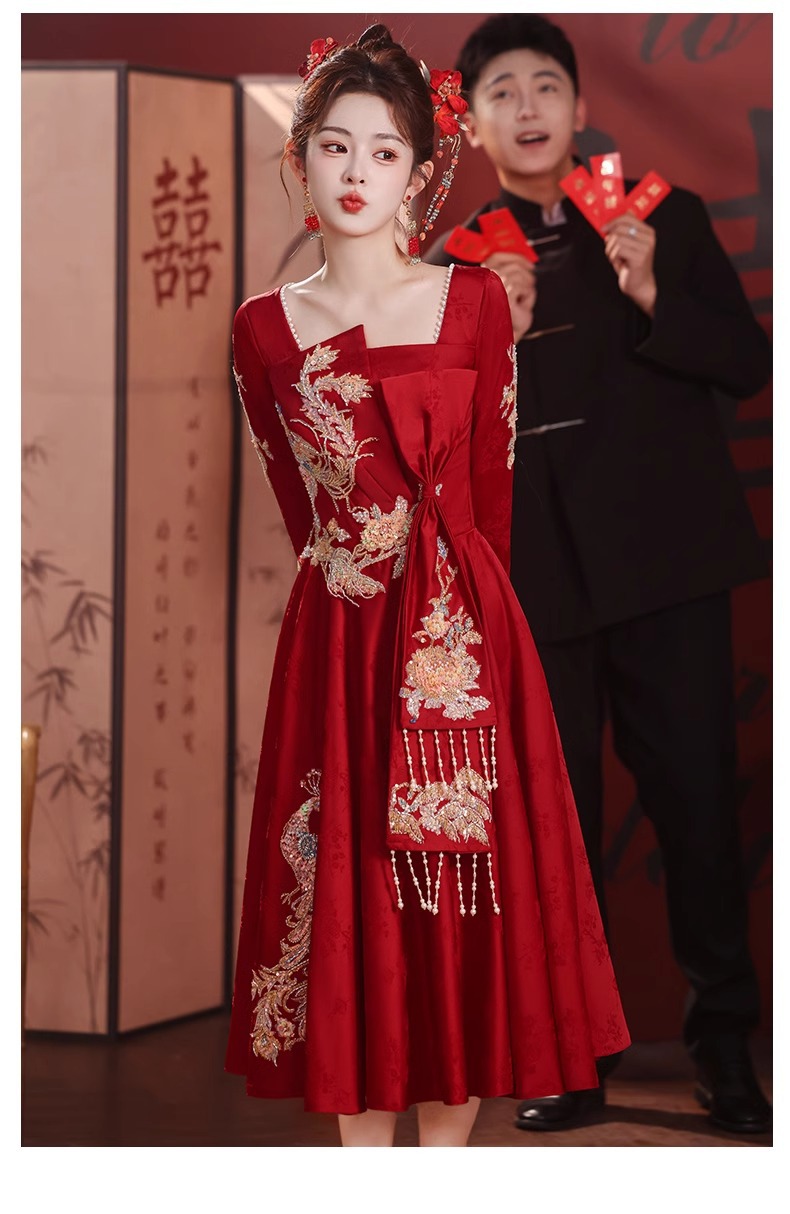 長袖乾杯服 花嫁 2025年秋冬新作 バーガンディ色 結婚式 婚約式 ドレス 刺繍入り