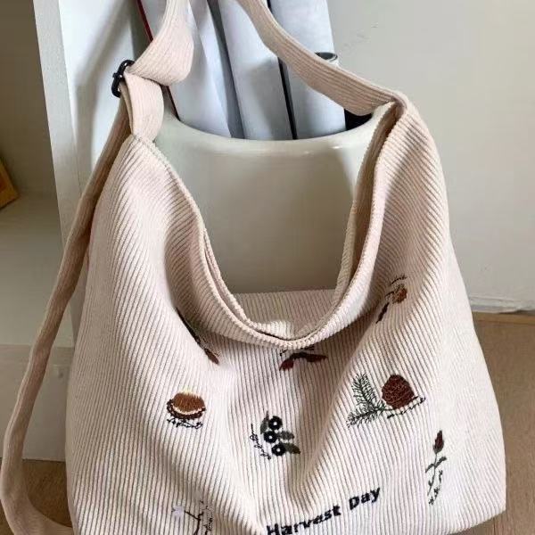 新款大容量单肩斜挎帆布包刺绣简约文艺风灯芯绒女包慵懒风购物袋