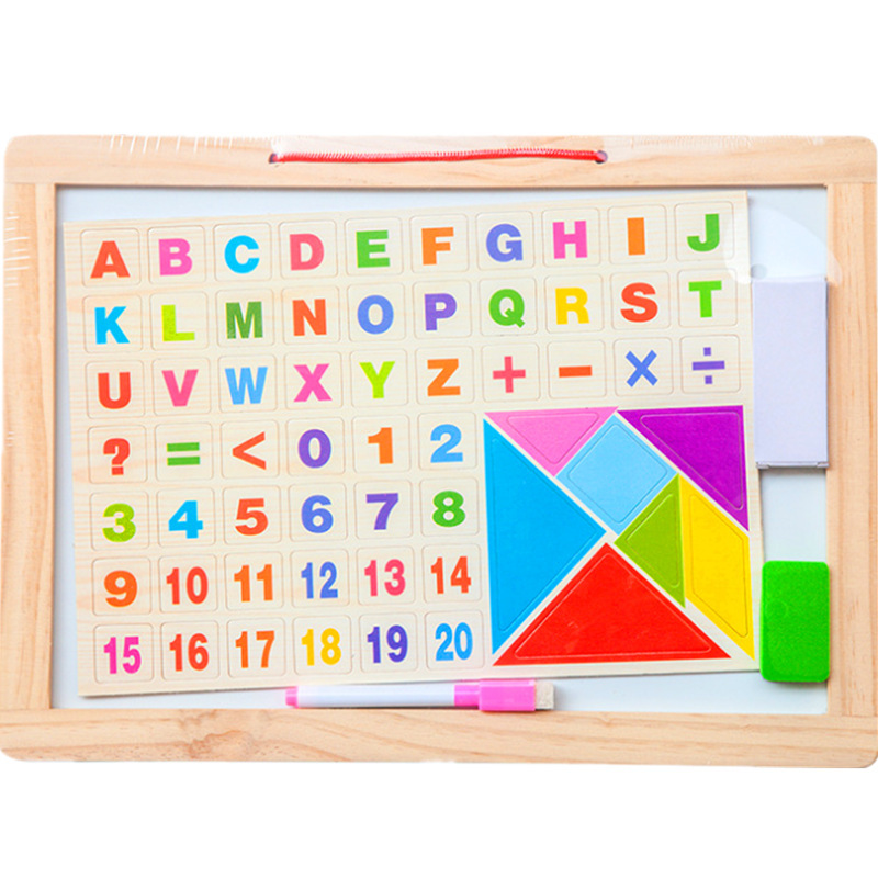 木製の数字のアルファベットの提式の小さい黒板の掛け式の両面は字の画板の教育を書いて早教の七巧板を展示します。