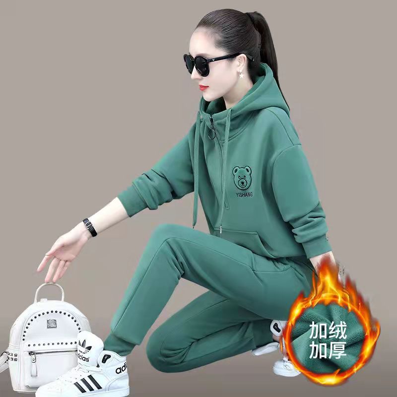 ベルベットの厚いスポーツスーツの女性秋冬服2025の新しい帽子の頭のセーターのカジュアルな服の2つのセットの洋風